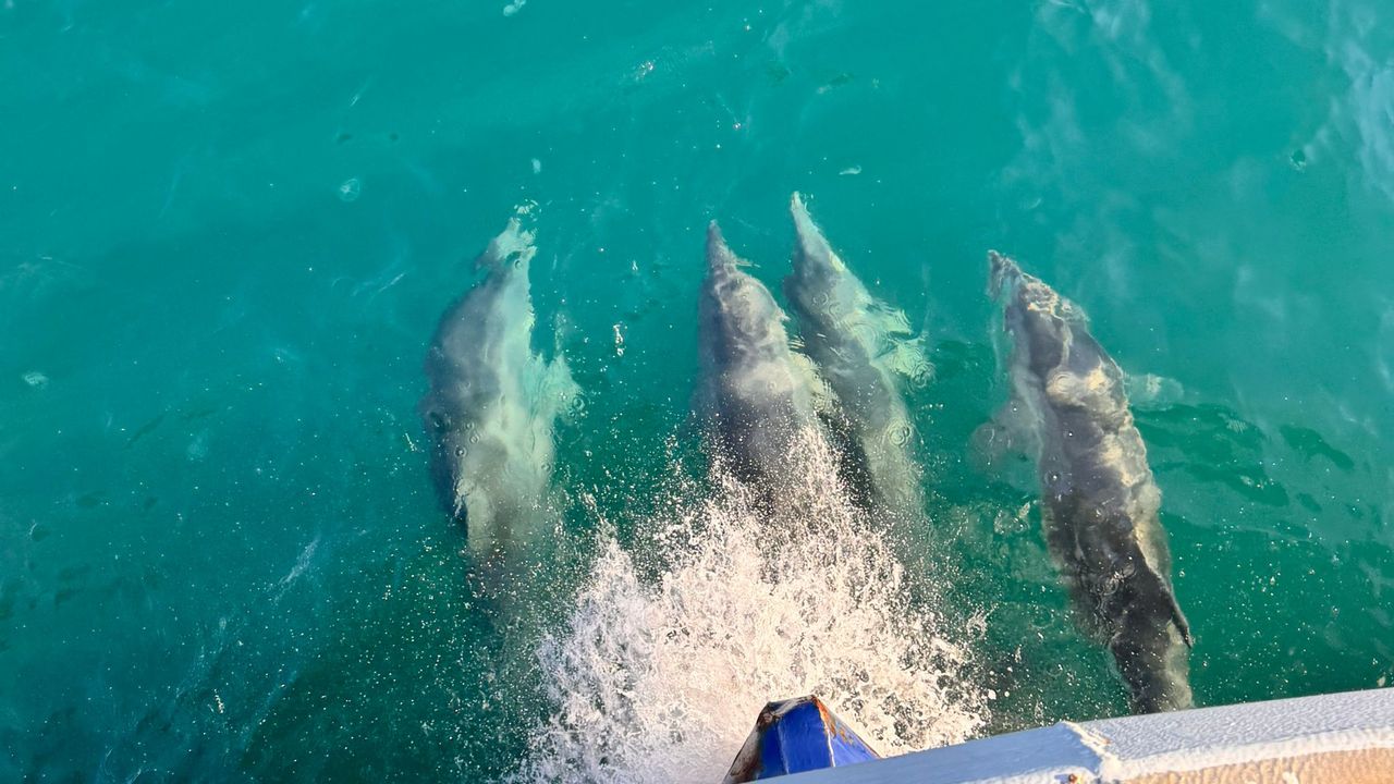 Yakakent ilçesinde avlanmak için açılan balıkçı teknesine yunus sürüsü eşlik etti. Balıkçılar, teknenin çevresinde yüzen yunusları, cep telefonu kamerasıyla kaydetti. Zaman zaman su yüzeyine çıkan yunuslar, bir süre sonra uzaklaştı. (DHA)