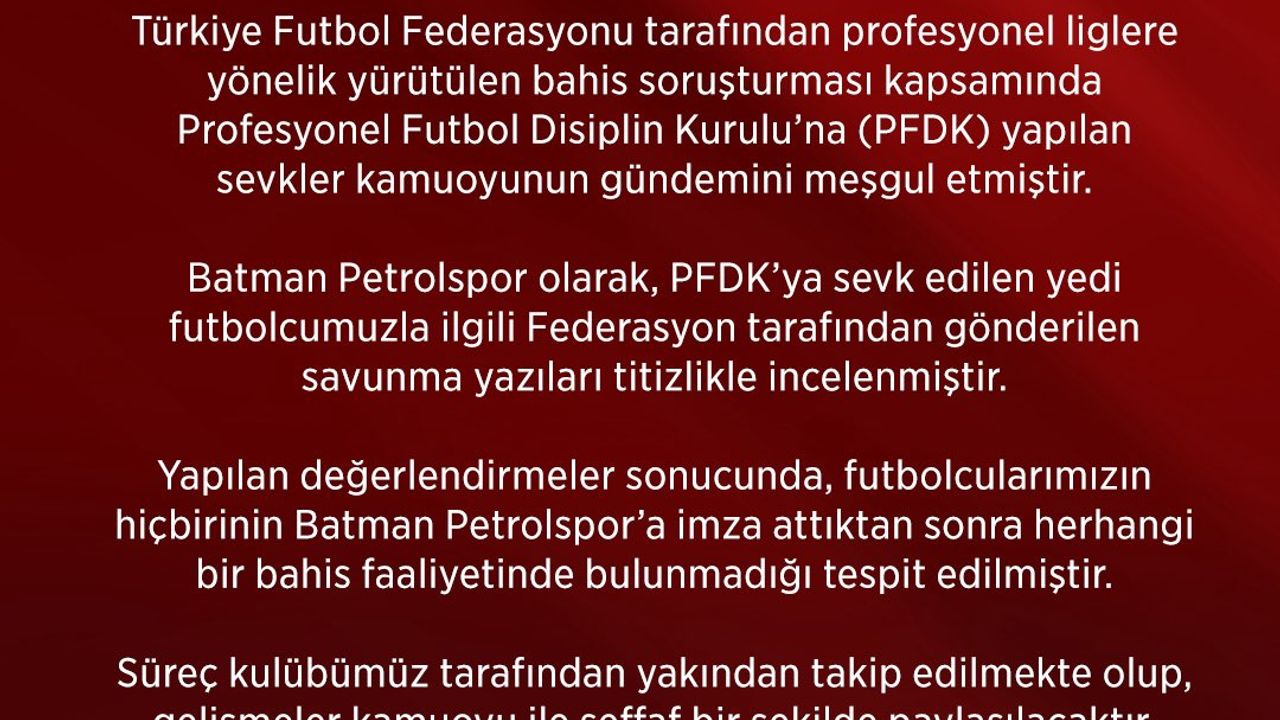 “Türkiye Futbol Federasyonu tarafından profesyonel liglere yönelik yürütülen bahis soruşturması kapsamında Profesyonel Futbol Disiplin Kurulu’na (PFDK) yapılan sevkler kamuoyunun gündemini meşgul etmiştir. Batman Petrolspor olarak, PFDK’ya sevk edilen 7 futbolcumuzla ilgili federasyon tarafından gönderilen savunma yazıları titizlikle incelenmiştir. Yapılan değerlendirmeler sonucunda, futbolcularımızın hiçbirinin Batman Petrolspor’a imza attıktan sonra herhangi bir bahis faaliyetinde bulunmadığı tespit edilmiştir. Süreç kulübümüz tarafından yakından takip edilmekte olup, gelişmeler kamuoyu ile şeffaf bir şekilde paylaşılacaktır.” (DHA)