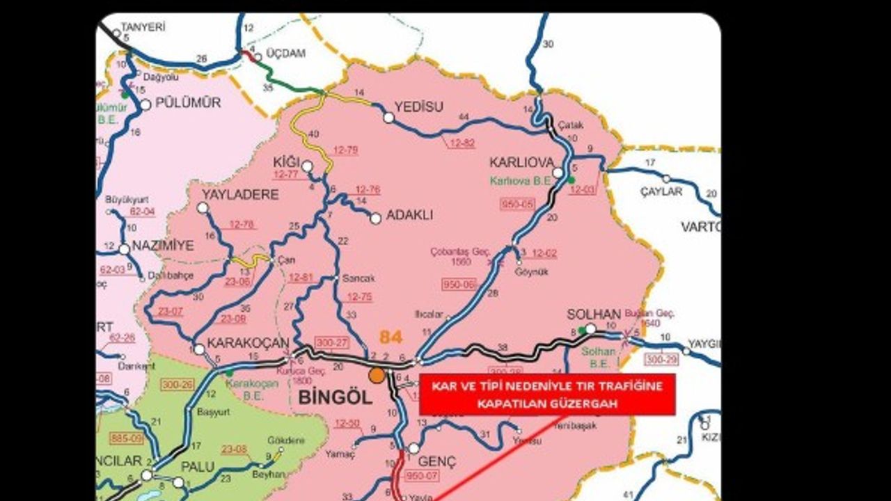 Bingöl Valiliği, Bingöl-Diyarbakır kara yolunun bir bölümünün TIR trafiğine kapatıldığını duyurdu. Valilik açıklamasında, 'Bingöl-Diyarbakır Devlet Yolunun 0-31 kilometreleri arası (Genç ilçe girişi ile Diyarbakır il sınırı arası) yoğun kar yağışı ve tipi nedeniyle saat 15.45 itibarıyla TIR trafiğine kapatılmıştır' denildi.