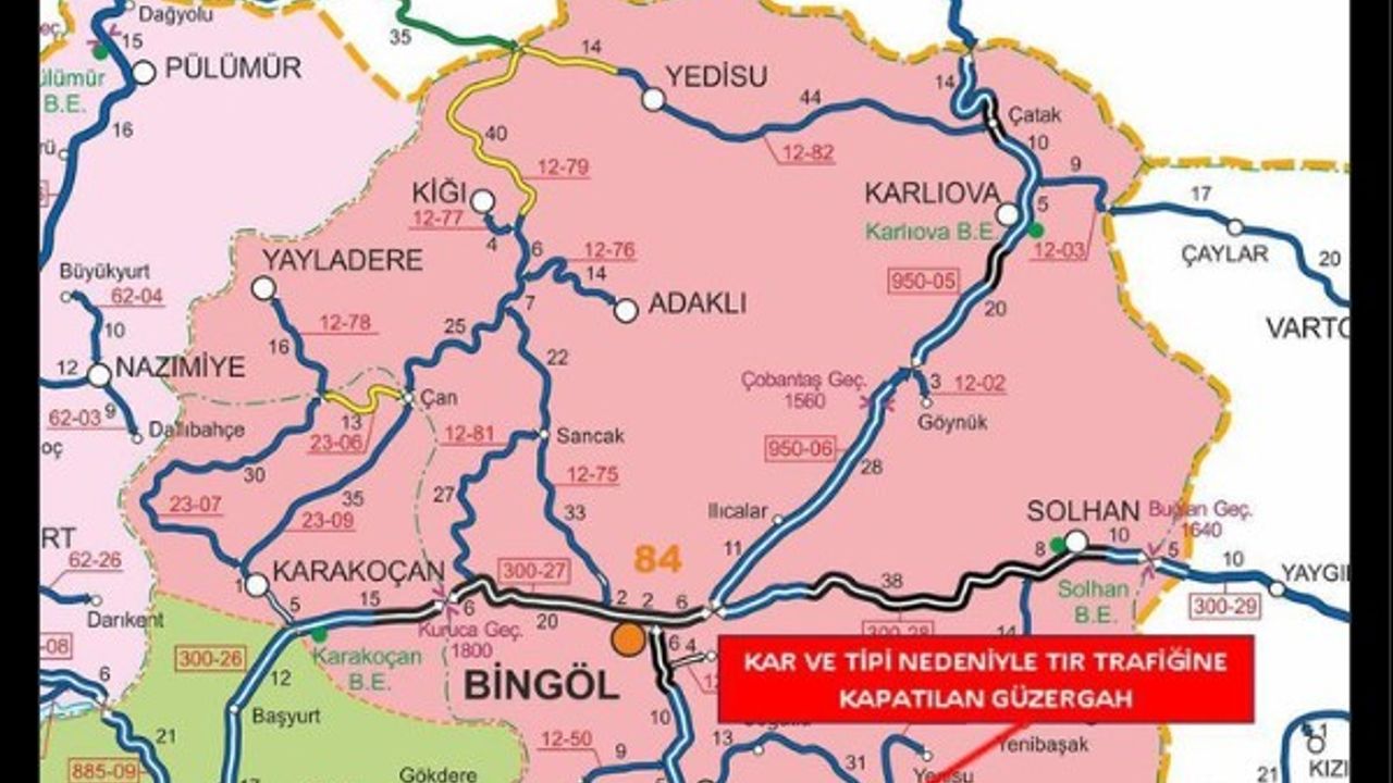 Bingöl Valiliği, sanal medya hesabında Bingöl-Diyarbakır kara yolunun yoğun kar yağışı nedeniyle TIR trafiğine kapatıldığını duyurdu. Açıklamada, 'Bingöl-Diyarbakır Devlet yolunun 0-31 kilometreleri arası (Genç ilçe girişi ile Diyarbakır il sınırı arası) yoğun kar yağışı ve tipi nedeniyle saat 13.00 itibariyle TIR trafiğine kapatılmıştır' denildi.