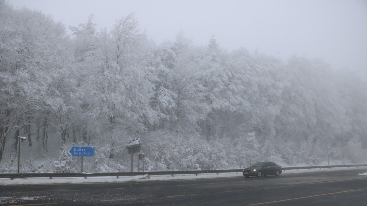Ankara ile İstanbul arasındaki en önemli geçiş noktalarından Bolu Dağı'nın D-100 kara yolu güzergahında hafif kar yağışı aralıklarla etkili oluyor. Bolu Dağı'nda yeşil alanlar karla kaplanırken, ulaşımda aksamalar yaşanmadı. Bolu Dağı'nda sabah saatlerinden itibaren sis de etkili oldu. Sis nedeniyle görüş mesafesi, 30 metreye kadar düştü. (DHA)