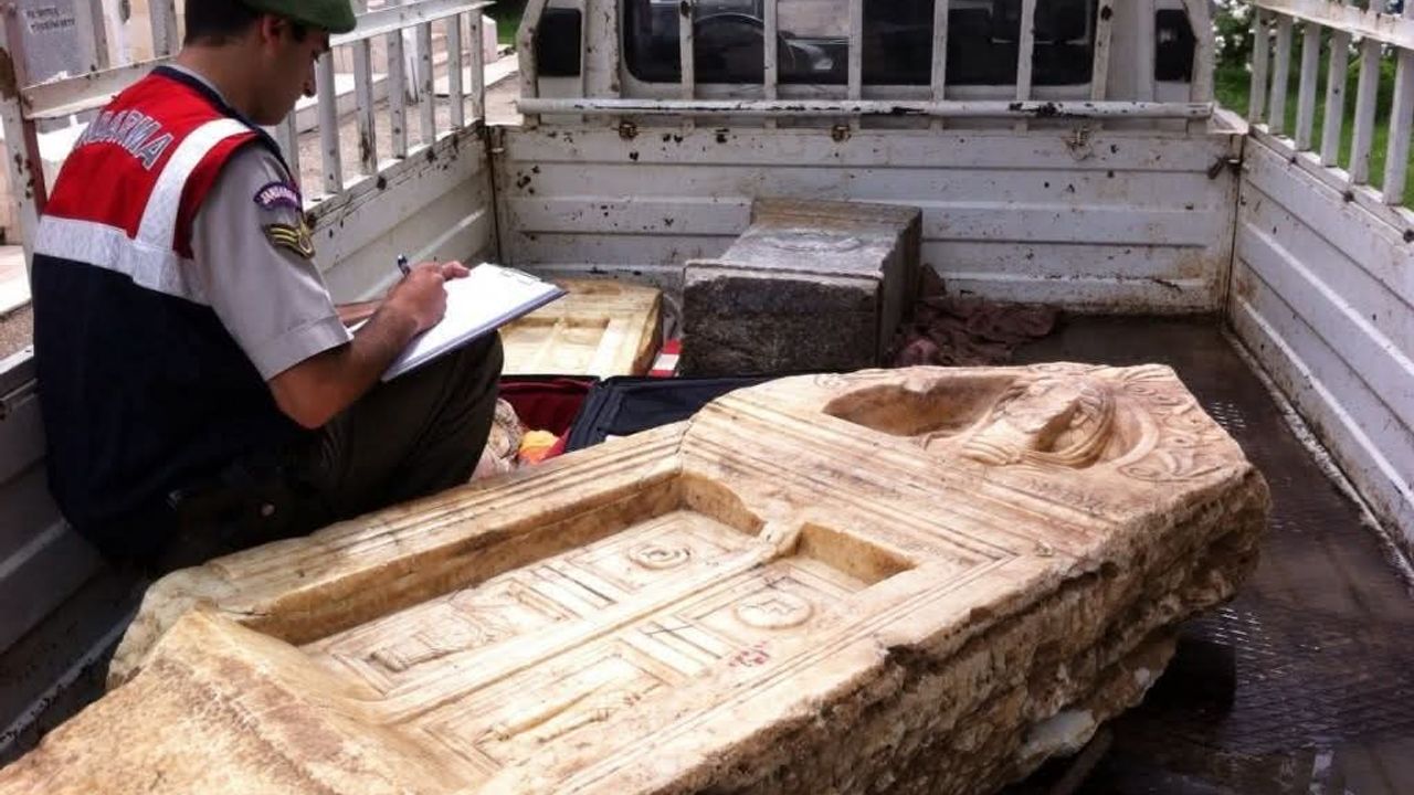 Bursa İl Jandarma Komutanlığı ekipleri, Orhaneli-Harmancık kara yolunda bir kamyoneti şüphe üzerine durdurdu. Araçta yapılan aramada brandanın altında aslan başı heykeli, Roma Dönemi’ne ait olduğu düşünülen tapınak taşı ile mezar steli ve rölyef ele geçirildi. Jandarma, araçta bulunan 3 kişiyi gözaltına alırken, ele geçirilen tarihi eserleri ise Bursa İl Müze Müdürlüğü'ne teslim edildi. (DHA)