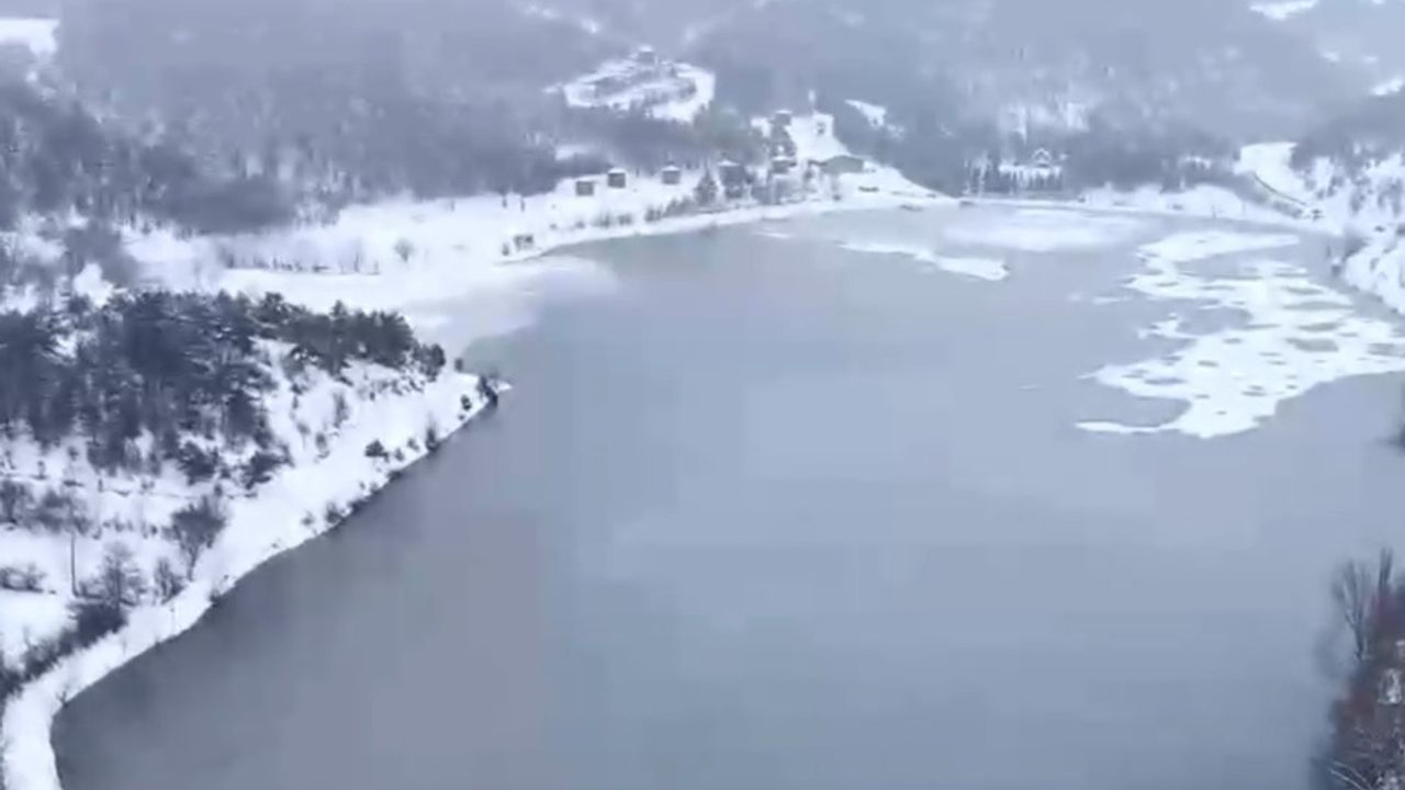 Zübeyde ÖZMEN/BOLU, (DHA)- BOLU'nun Göynük ilçesindeki yüzeyi buz tutan Çubuk Gölü Tabiat Parkı, dronla görüntülendi.