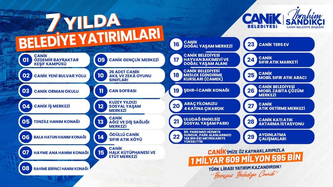 Canik Belediye Başkanı İbrahim Sandıkçı, yeni projeleri ve yatırımları ilçeye kazandırmaya devam ettiklerini ifade etti. Yüksek mali disiplin ilkesiyle gerçekleştirdikleri çalışmalarla, ilçeye sosyal yaşam alanlarından eğitim merkezlerine kadar birçok alanda geleceğe yönelik projeler ve yatırımlar kazandırdıklarını söyleyen Başkan Sandıkçı, 7 yılda ilçeye 1 milyar 609 milyon 595 bin TL değerinde yatırım kazandırdıklarının altını çizdi. Belediyenin öz kaynaklarıyla yeni projeleri ve yatırımları ilçeye kazandırmaya devam ettiklerini vurgulayan Başkan İbrahim Sandıkçı, Canik'i her alanda ileriye taşımaya devam edeceklerini ve Türkiye'de ilk ve örnek olan yatırımları hayata geçirmeyi sürdürdüklerini dile getirdi.