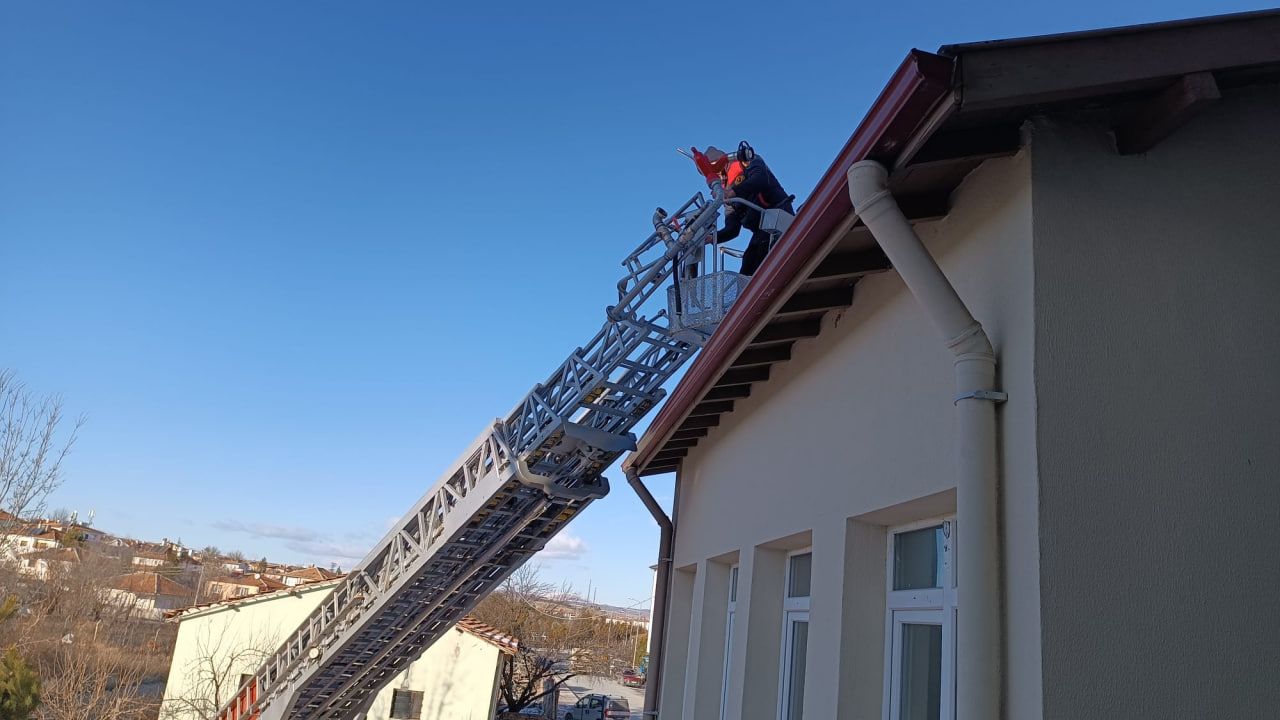 Alaca ilçesi Ankara Caddesi üzerinde bulunan İlçe Tarım ve Orman Müdürlüğü binasının çatısından kedi sesi geldiğini fark eden vatandaşlar, durumu itfaiye ekiplerine bildirdi. İhbar üzerine kısa sürede olay yerine gelen Alaca Belediyesi İtfaiye ekipleri, kurtarma çalışması başlattı. Ekipler, çatıda mahsur kalan kediyi yakalamaya çalıştı. Çatının üzerine çıkan bir itfaiye eri, yaklaşık 20 dakikalık bir çalışmanın ardından kediyi mahsur kaldığı çatıdan kurtararak güvenli bir şekilde aşağıya indirdi. Soğuktan ve açlıktan etkilendiği belirtilen kedi, yapılan kontrollerin ardından doğal yaşam alanına bırakıldı. (DHA)