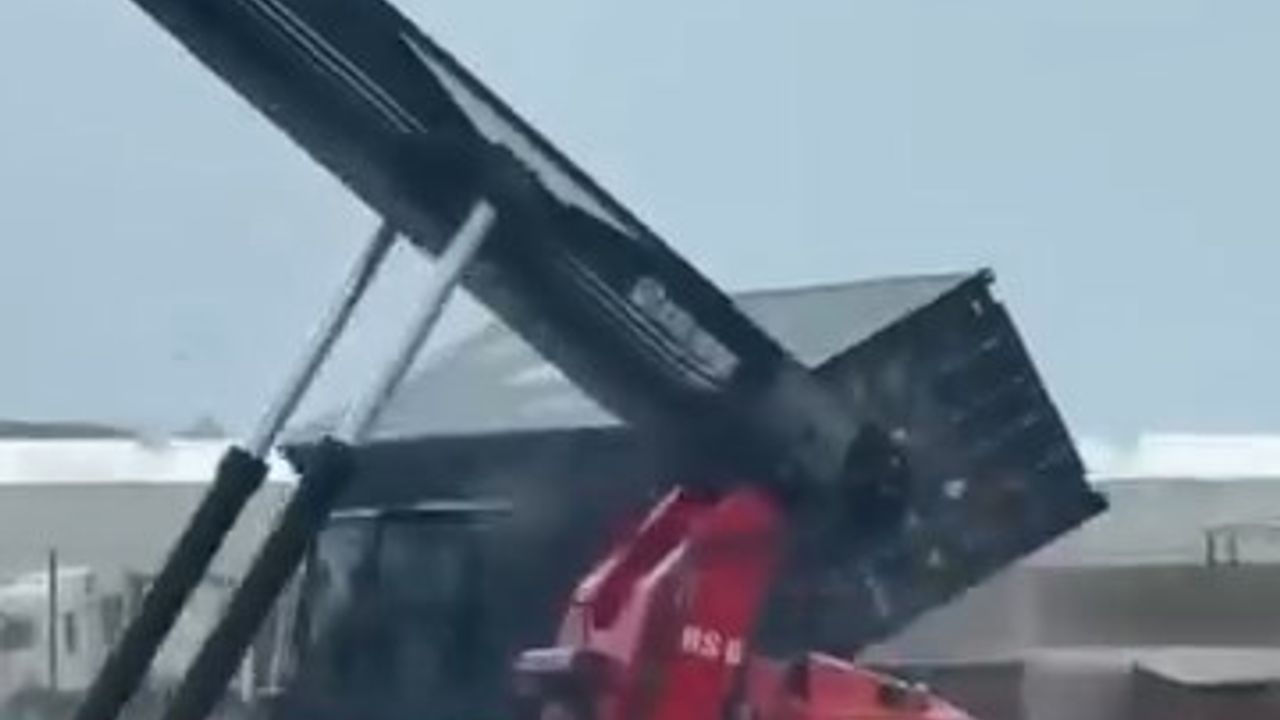 Kocaeli'de etkili olan fırtına nedeniyle bir işçi, önündeki saç parçanın aniden savrulması sonucu dengesini kaybederek metrelerce sürüklendi. Limanda istiflenen konteynerlerden bazıları rüzgarın etkisiyle düştü. Başka bir noktadaki limanda ise vinç devrildi. Konteyner yüklü bir TIR'ın dorsesindeki konteyner de rüzgarın etkisiyle kaydı. O anlar cep telefonu kamerasıyla kaydedildi. (DHA)