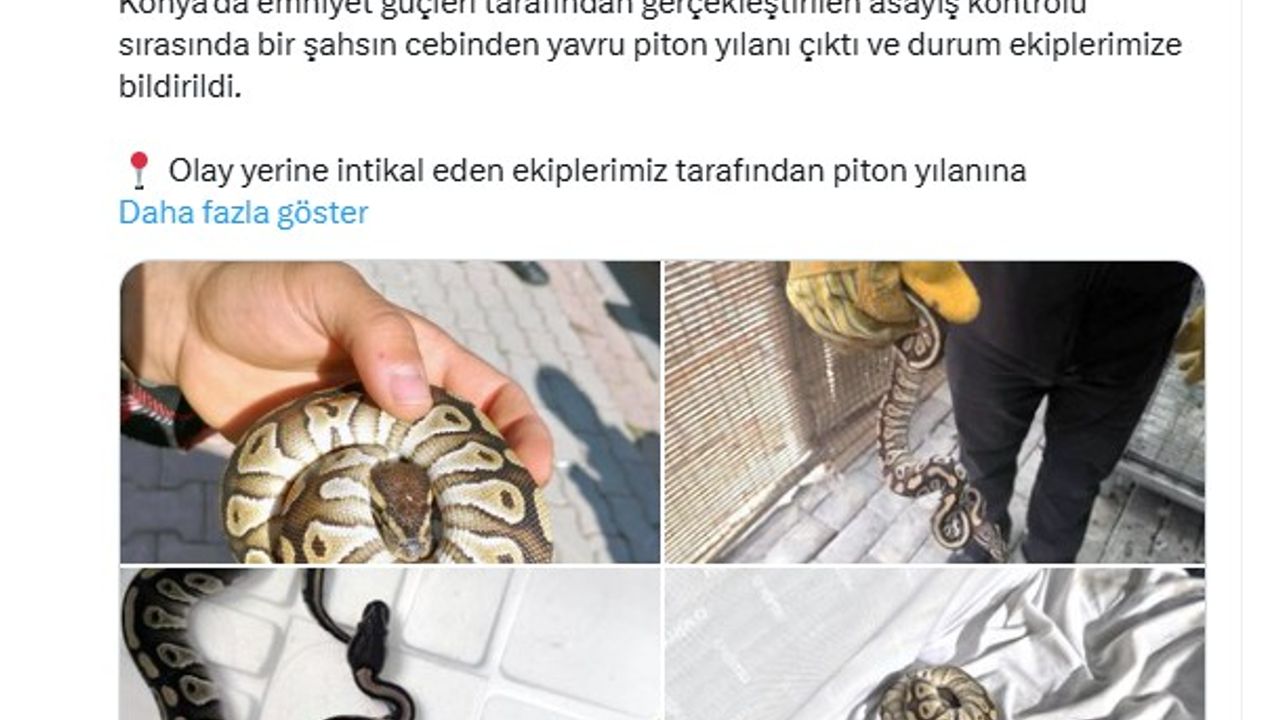 Tarım ve Orman Bakanlığı Doğa Koruma ve Milli Parklar Genel Müdürlüğü'nün sosyal medya hesabından yapılan açıklamada, "Konya'da emniyet güçleri tarafından gerçekleştirilen asayiş kontrolü sırasında bir şahsın cebinden yavru piton yılanı çıktı ve durum ekiplerimize bildirildi. Olay yerine intikal eden ekiplerimiz tarafından piton yılanına el konulurken ilgili şahsa da idari para cezası uygulandı. Teslim alınan yavru piton, sağlık kontrollerinin yapılması amacıyla Karatay Hayvanat Bahçesi veteriner hekimlerine teslim edildi. Yaban hayvanlarını doğadan izinsiz almak, bulundurmak, satmak yasaktır ve cezai işlem gerektirir. Doğaya birlikte sahip çıkalım” denildi. (DHA)