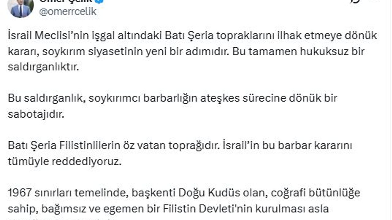 ANKARA, (DHA)- AK Parti Genel Başkan Yardımcısı ve Parti Sözcüsü Ömer Çelik, "İsrail Meclisi’nin işgal altındaki Batı Şeria topraklarını ilhak etmeye dönük kararı, soykırım siyasetinin yeni bir adımıdır. Bu tamamen hukuksuz bir saldırganlıktır" dedi.