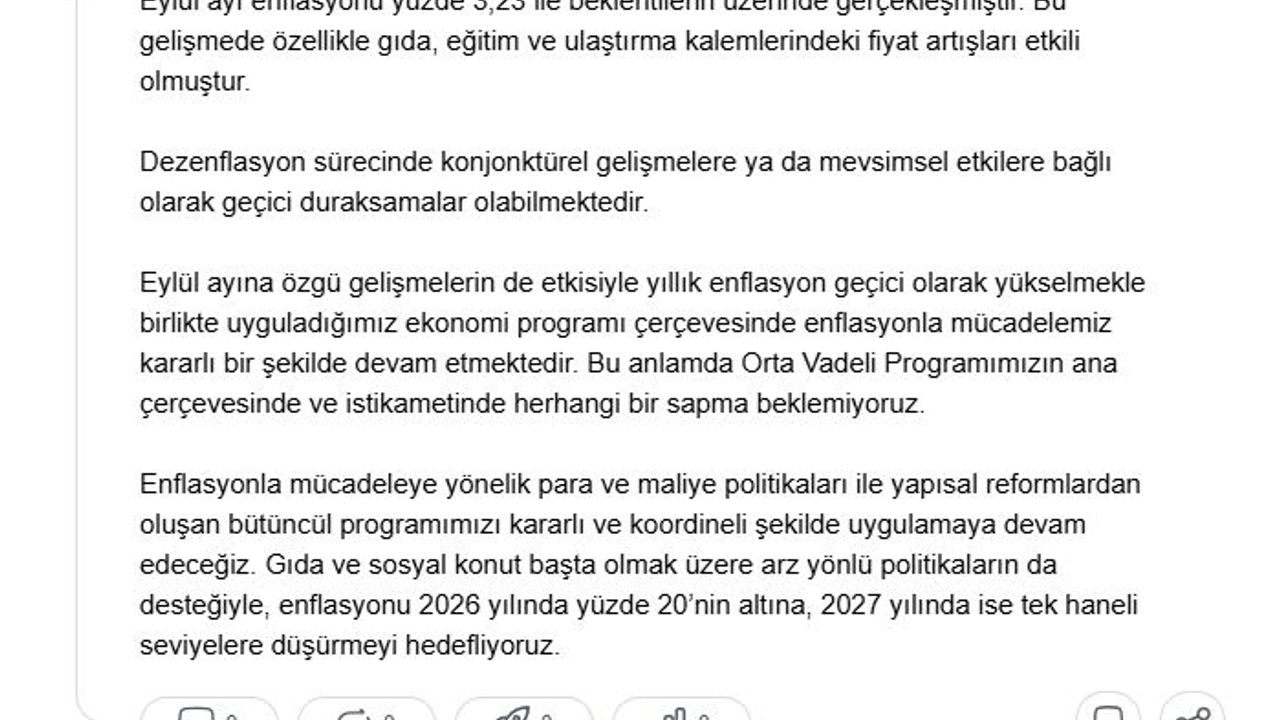 Cumhurbaşkanı Yardımcısı Cevdet Yılmaz, eylül ayı enflasyon verilerine ilişkin NSosyal hesabından açıklama yaptı. Yılmaz, "Eylül ayı enflasyonu yüzde 3,23 ile beklentilerin üzerinde gerçekleşmiştir. Bu gelişmede özellikle gıda, eğitim ve ulaştırma kalemlerindeki fiyat artışları etkili olmuştur. Dezenflasyon sürecinde konjonktürel gelişmelere ya da mevsimsel etkilere bağlı olarak geçici duraksamalar olabilmektedir. Eylül ayına özgü gelişmelerin de etkisiyle yıllık enflasyon geçici olarak yükselmekle birlikte uyguladığımız ekonomi programı çerçevesinde enflasyonla mücadelemiz kararlı bir şekilde devam etmektedir. Bu anlamda Orta Vadeli Programımızın ana çerçevesinde ve istikametinde herhangi bir sapma beklemiyoruz. Enflasyonla mücadeleye yönelik para ve maliye politikaları ile yapısal reformlardan oluşan bütüncül programımızı kararlı ve koordineli şekilde uygulamaya devam edeceğiz. Gıda ve sosyal konut başta olmak üzere arz yönlü politikaların da desteğiyle, enflasyonu 2026 yılında yüzde 20'nin altına, 2027 yılında ise tek haneli seviyelere düşürmeyi hedefliyoruz" dedi. (DHA)