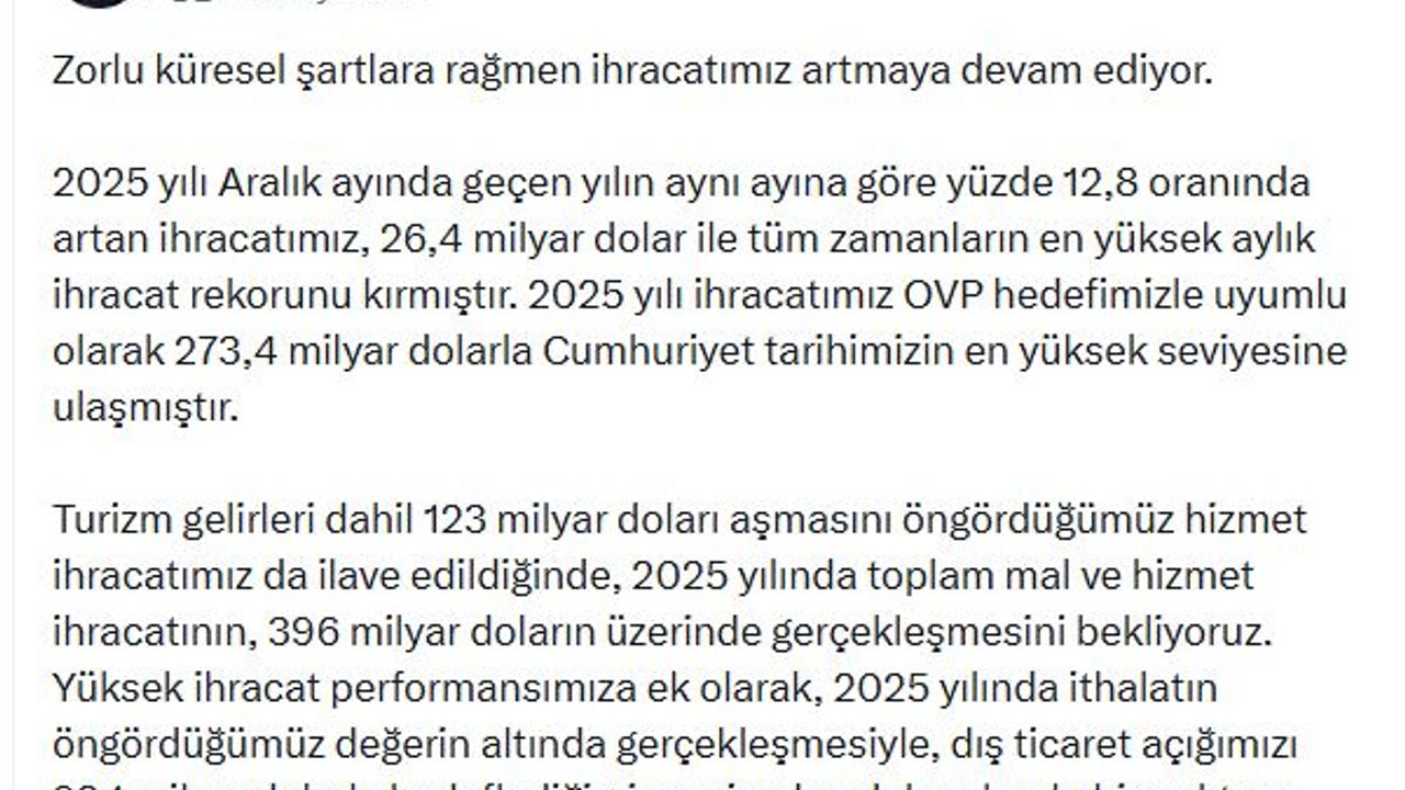 Cumhurbaşkanı Yardımcısı Yılmaz, sanal medya hesabından yaptığı paylaşımda, zorlu küresel şartlara rağmen ihracatın artmaya devam ettiğini belirterek, '2025 yılı Aralık ayında geçen yılın aynı ayına göre yüzde 12,8 oranında artan ihracatımız, 26,4 milyar dolar ile tüm zamanların en yüksek aylık ihracat rekorunu kırmıştır. 2025 yılı ihracatımız OVP hedefimizle uyumlu olarak 273,4 milyar dolarla Cumhuriyet tarihimizin en yüksek seviyesine ulaşmıştır. Turizm gelirleri dahil 123 milyar doları aşmasını öngördüğümüz hizmet ihracatımız da ilave edildiğinde, 2025 yılında toplam mal ve hizmet ihracatının, 396 milyar doların üzerinde gerçekleşmesini bekliyoruz. Yüksek ihracat performansımıza ek olarak, 2025 yılında ithalatın öngördüğümüz değerin altında gerçekleşmesiyle, dış ticaret açığımızı 92,1 milyar dolarla hedeflediğimiz seviyeden daha olumlu bir noktaya taşıdık. Dış ticaret performansımızı önümüzdeki dönemde daha üst seviyelere taşımayı amaçlıyoruz. Önümüzdeki 3 yılda da ticaret ortaklarımızda büyümenin yüzde 2,5 oranında yukarı yönlü olması, ihracatımızı desteklemeye devam edecektir. Bu çerçevede, 2026 yılında mal ihracatımızı 282 milyar dolar düzeyine yükseltmeyi, mal ve hizmet ihracatında ise 410 milyar doları aşmayı hedefliyoruz. Bu olumlu gelişmeler ile cari açığımız düşük seviyelerde kalmaya devam edecek, dış finansman ihtiyacımız azalacak ve finansal istikrarımız pekişecektir. Düşük cari açık ile desteklenen enflasyonla mücadelemizi kararlı şekilde sürdürürken; dengeli büyüme yaklaşımı ile yatırım, üretim, istihdam ve ihracatı artırmaya devam edeceğiz. Korumacılık eğilimlerinin hızla arttığı, tarifeler ve ihracat kısıtlamalarının yaygınlaştığı bu zorlu küresel ortamda sergiledikleri güçlü performans için, başta Ticaret Bakanlığımız olmak üzere tüm kurumlarımızı ve ihracatçılarımızı yürekten tebrik ediyorum' dedi. (DHA)