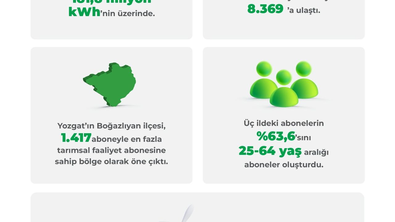 CK Enerji Çamlıbel Elektrik Tarımın Enerjisi raporunda üç ildeki tarımsal faaliyet abonelerinde 2012 yılından bu yana gözlenen artışa da yer verildi. Rapora göre Sivas, Tokat ve Yozgat’ta tarımsal faaliyetlere yönelik abone sayısı, 2012 yılında 625 iken 2025 yılı itibarıyla 8 bin 369’a ulaştı. Aradan geçen sürede bölgedeki tarım abone sayısı yüzde 1.239 arttı. Tarımsal faaliyet aboneleri alt kırılımına bakıldığında 7 bin 672 abone ile tarımsal işletmeler birinci sırada yer alırken hayvancılık işletmeleri 697 abone ile ikinci sırada yer aldı. Tarımsal faaliyet abonelerinin illere göre dağılımda Tokat yüzde 23, Sivas yüzde 33,9, Yozgat ise yüzde 43,1 paya sahip oldu. Üç il arasında Yozgat’ın Boğazlıyan ilçesi, 1.417 aboneyle en fazla tarımsal faaliyet abonesine sahip bölge olarak öne çıktı. Bu sayı, toplam tarım abonelerinin yaklaşık yüzde 17’sine karşılık gelirken Boğazlıyan’ı 911 aboneyle Sivas Merkez izledi.