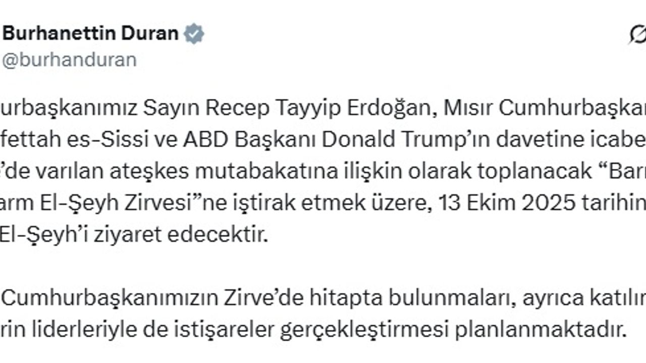 İletişim Başkanı Burhanettin Duran, sosyal medya hesabından yaptığı açıklamada, "Cumhurbaşkanımız Sayın Recep Tayyip Erdoğan, Mısır Cumhurbaşkanı Abdulfettah es-Sissi ve ABD Başkanı Donald Trump’ın davetine icabetle, Gazze’de varılan ateşkes mutabakatına ilişkin olarak toplanacak 'Barış için Şarm El-Şeyh Zirvesi'ne iştirak etmek üzere, 13 Ekim 2025 tarihinde Şarm El-Şeyh’i ziyaret edecektir. Sayın Cumhurbaşkanımızın Zirve’de hitapta bulunmaları, ayrıca katılımcı ülkelerin liderleriyle de istişareler gerçekleştirmesi planlanmaktadır" dedi. (DHA)
