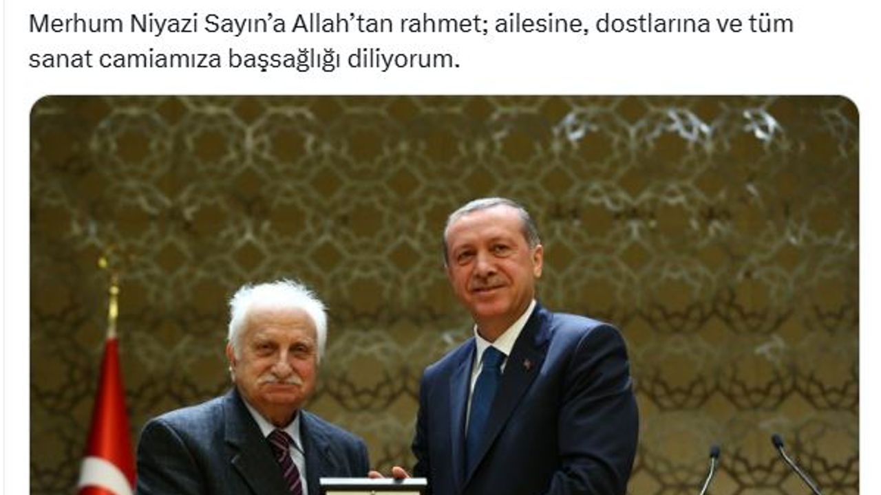 ANKARA, (DHA)- CUMHURBAŞKANI Recep Tayyip Erdoğan, Cumhurbaşkanlığı Kültür ve Sanat Büyük Ödülü sahibi neyzen Niyazi Sayın'ın (98) vefatı nedeniyle başsağlığı mesajı paylaştı.