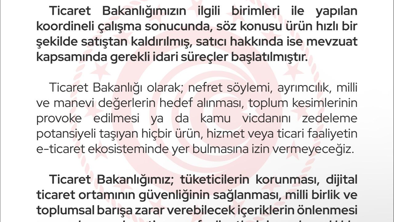 Bakanlığın sosyal medya hesabından yapılan açıklamada, "Bir e-ticaret platformunda, toplumumuzun inanç ve değerlerini hedef alan ürünlerin satışa sunulduğuna ilişkin kamuoyuna yansıyan paylaşımlar üzerine Ticaret Bakanlığımızca derhal inceleme başlatılmıştır. Ticaret Bakanlığımızın ilgili birimleri ile yapılan koordineli çalışma sonucunda, söz konusu ürün hızlı bir şekilde satıştan kaldırılmış, satıcı hakkında ise mevzuat kapsamında gerekli idari süreçler başlatılmıştır. Ticaret Bakanlığı olarak; nefret söylemi, ayrımcılık, milli ve manevi değerlerin hedef alınması, toplum kesimlerinin provoke edilmesi ya da kamu vicdanını zedeleme potansiyeli taşıyan hiçbir ürün, hizmet veya ticari faaliyetin e-ticaret ekosisteminde yer bulmasına izin vermeyeceğiz. Ticaret Bakanlığımız; tüketicilerin korunması, dijital ticaret ortamının güvenliğinin sağlanması, milli birlik ve toplumsal barışa zarar verebilecek içeriklerin önlenmesi amacıyla denetim faaliyetlerini kararlılıkla sürdürmektedir. Kamu düzenini zedeleyici her türlü ticari faaliyete karşı gerekli tüm adımlar, hiçbir gecikmeye mahal verilmeden atılacaktır" denildi. (DHA)