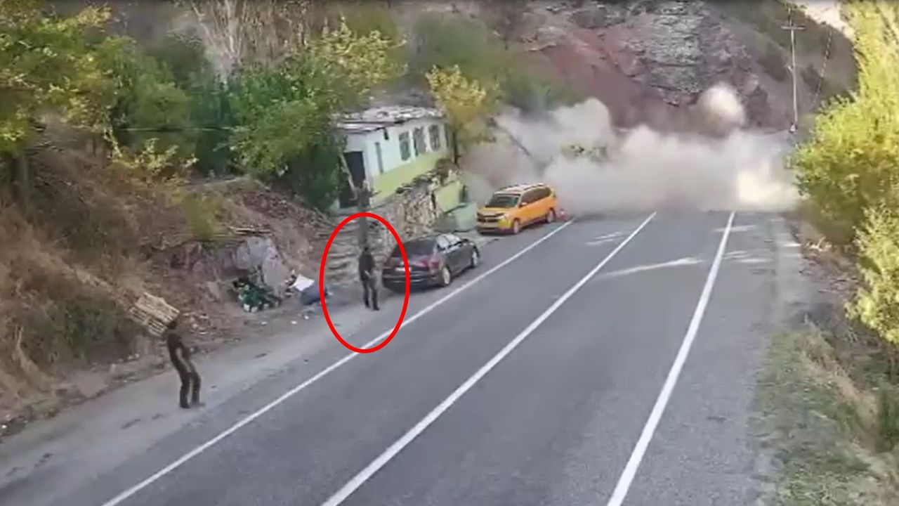 Serhat Ozan YILDIRIM/TUNCELİ, (DHA)- TUNCELİ’de yol kenarında bekleyen taksi şoförü, dağdan kopan kaya parçalarının altında kalmaktan başka birinin ‘Kaç’ uyarısıyla son anda kurtuldu. O anlar güvenlik kamerasına yansıdı.
