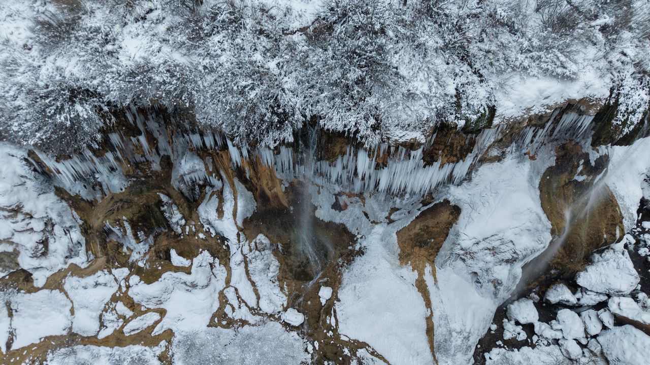 41 hektarlık bir alanı kapsayan şelalenin kış manzarası, havadan dronla görüntülendi. İlkbaharda mavi ve yeşil renkleri yansıtan, sonbaharda ağaçların sarı ve kızıl tonlara dönüşmesi ile tüm pastel renkleri harmanlayan şelale kışın da buzdan görüntüsüyle doğa ve fotoğraf meraklıların ilgisini çekiyor. Yamaçtan yaklaşık 100 metrelik metal merdiven ile inilen şelale, her mevsim ziyaretçilerin gözde mekanı arasında yer alıyor. (DHA)