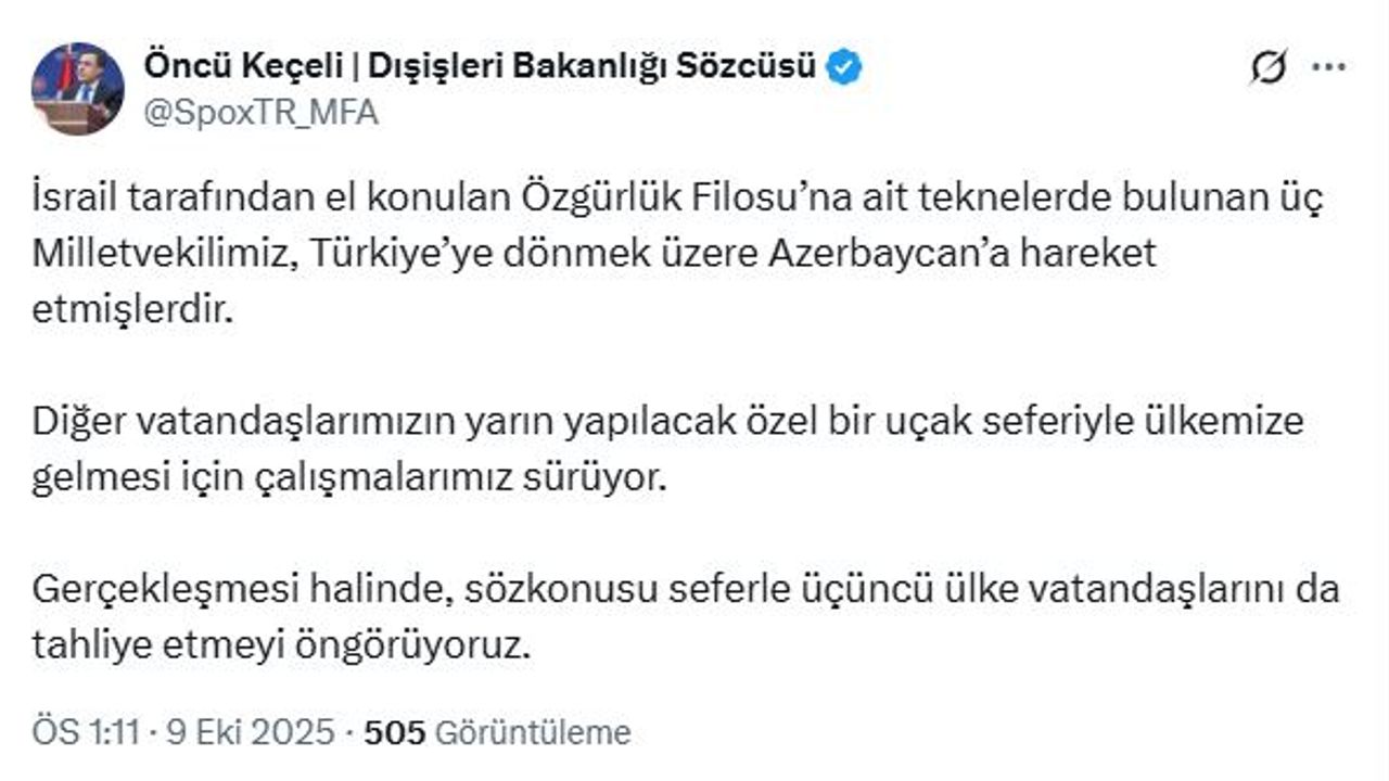 Dışişleri Bakanlığı Sözcüsü Öncü Keçeli, İsrail tarafından alıkonulan Özgürlük Filosu'na ait teknelerde bulunan Yeni Yol Partisi milletvekilleri Necmettin Çalışkan, Sema Silkin Ün ve Mehmet Atmaca'nın, Türkiye'ye dönmek üzere Azerbaycan'a hareket ettiklerini açıkladı. Keçeli, sosyal medya hesabından yaptığı açıklamada, "İsrail tarafından el konulan Özgürlük Filosu'na ait teknelerde bulunan üç milletvekilimiz, Türkiye'ye dönmek üzere Azerbaycan'a hareket etmişlerdir. Diğer vatandaşlarımızın yarın yapılacak özel bir uçak seferiyle ülkemize gelmesi için çalışmalarımız sürüyor. Gerçekleşmesi halinde, söz konusu seferle üçüncü ülke vatandaşlarını da tahliye etmeyi öngörüyoruz" dedi. (DHA)