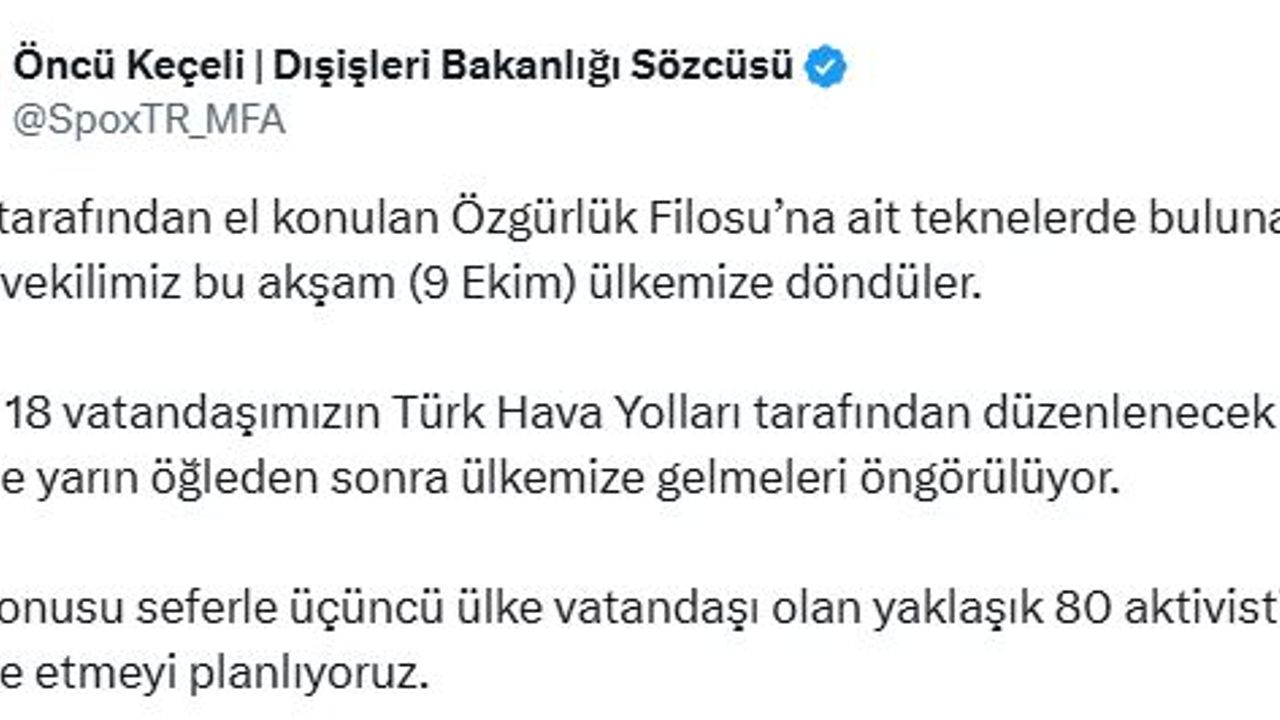 Dışişleri Bakanlığı Sözcüsü Keçeli, Özgürlük Filosu'na gerçekleştirilen müdahale sonrası alıkonulan Türk vatandaşlarının tahliyesine ilişkin, sosyal medya hesabından açıklama yaptı. Keçeli, "İsrail tarafından el konulan Özgürlük Filosu’na ait teknelerde bulunan üç Milletvekilimiz bu akşam (9 Ekim) ülkemize döndüler. Diğer 18 vatandaşımızın Türk Hava Yolları tarafından düzenlenecek özel seferle yarın öğleden sonra ülkemize gelmeleri öngörülüyor. Söz konusu seferle üçüncü ülke vatandaşı olan yaklaşık 80 aktivisti de tahliye etmeyi planlıyoruz" ifadelerini kullandı. (DHA)