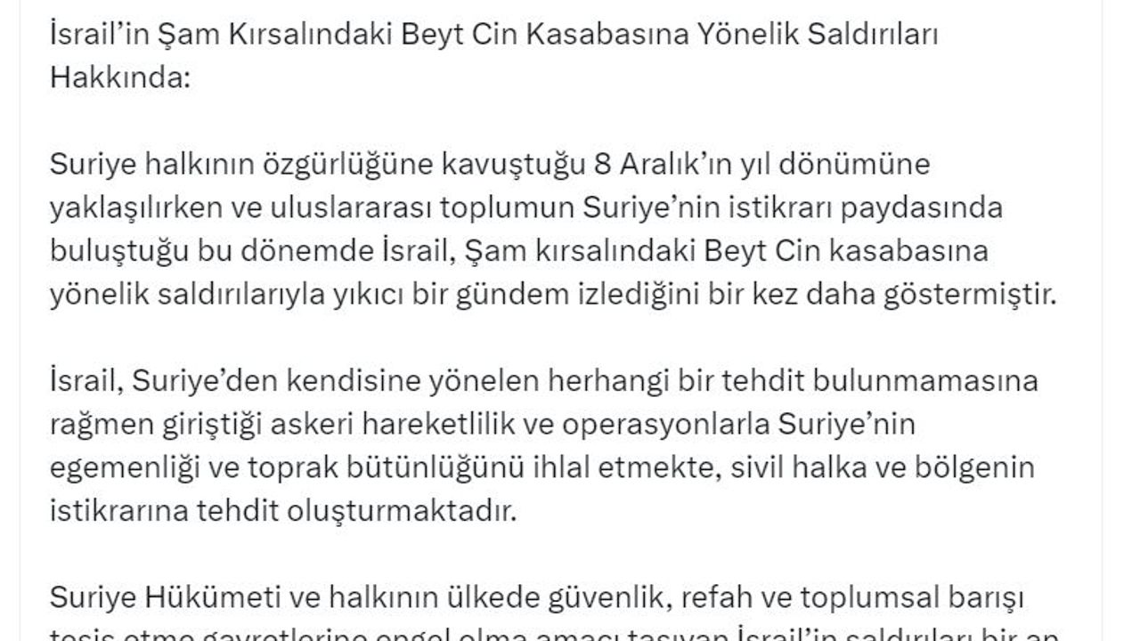 Dışişleri Sözcüsü Keçeli, sosyal medya hesabından yaptığı açıklamada, "Suriye halkının özgürlüğüne kavuştuğu 8 Aralık'ın yıl dönümüne yaklaşılırken ve uluslararası toplumun Suriye'nin istikrarı paydasında buluştuğu bu dönemde İsrail, Şam kırsalındaki Beyt Cin kasabasına yönelik saldırılarıyla yıkıcı bir gündem izlediğini bir kez daha göstermiştir. İsrail, Suriye'den kendisine yönelen herhangi bir tehdit bulunmamasına rağmen giriştiği askeri hareketlilik ve operasyonlarla Suriye'nin egemenliği ve toprak bütünlüğünü ihlal etmekte, sivil halka ve bölgenin istikrarına tehdit oluşturmaktadır. Suriye hükümeti ve halkının ülkede güvenlik, refah ve toplumsal barışı tesis etme gayretlerine engel olma amacı taşıyan İsrail'in saldırıları bir an evvel sona erdirilmelidir. Bu hususta uluslararası toplumun sorumluluk sahibi tüm üyelerine vazife düşmektedir" dedi. (DHA)