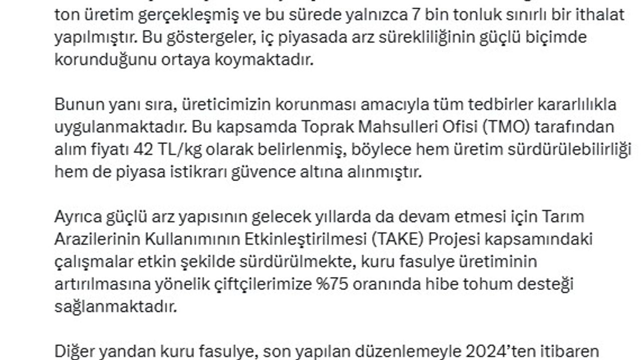 Üreticilerin korunması amacıyla tüm tedbirlerin kararlılıkla uygulandığı belirtilen açıklamada, "Bu kapsamda Toprak Mahsulleri Ofisi (TMO) tarafından alım fiyatı 42 TL/kilogram olarak belirlenmiş, böylece hem üretim sürdürülebilirliği hem de piyasa istikrarı güvence altına alınmıştır. Ayrıca güçlü arz yapısının gelecek yıllarda da devam etmesi için Tarım Arazilerinin Kullanımının Etkinleştirilmesi (TAKE) Projesi kapsamındaki çalışmalar etkin şekilde sürdürülmekte, kuru fasulye üretiminin artırılmasına yönelik çiftçilerimize yüzde 75 oranında hibe tohum desteği sağlanmaktadır" açıklaması yapıldı.
