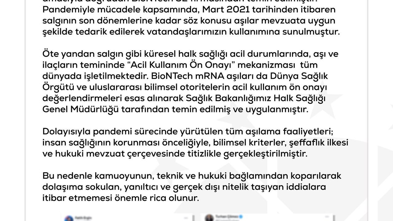 DMM'nin sosyal medya hesabından yapılan açıklamada, “Bazı sosyal medya mecralarında, COVID-19 salgını sürecinde ülkemize 'BioNTech aşısı gelmediği' yönünde ileri sürülen iddialar gerçeği yansıtmamakta olup; kamuoyunu yanıltmaya yönelik dezenformasyon içermektedir. COVID-19’a karşı geliştirilen BioNTech mRNA aşıları, klinik kullanım amacıyla doğrudan BioNTech SE firmasından temin edilmiştir. Pandemiyle mücadele kapsamında, Mart 2021 tarihinden itibaren salgının son dönemlerine kadar söz konusu aşılar mevzuata uygun şekilde tedarik edilerek vatandaşlarımızın kullanımına sunulmuştur. Öte yandan salgın gibi küresel halk sağlığı acil durumlarında, aşı ve ilaçların temininde 'acil kullanım ön onayı' mekanizması tüm dünyada işletilmektedir. BioNTech mRNA aşıları da Dünya Sağlık Örgütü ve uluslararası bilimsel otoritelerin acil kullanım ön onayı değerlendirmeleri esas alınarak Sağlık Bakanlığı'mız Halk Sağlığı Genel Müdürlüğü tarafından temin edilmiş ve uygulanmıştır. Dolayısıyla pandemi sürecinde yürütülen tüm aşılama faaliyetleri; insan sağlığının korunması önceliğiyle, bilimsel kriterler, şeffaflık ilkesi ve hukuki mevzuat çerçevesinde titizlikle gerçekleştirilmiştir. Bu nedenle kamuoyunun, teknik ve hukuki bağlamından koparılarak dolaşıma sokulan, yanıltıcı ve gerçek dışı nitelik taşıyan iddialara itibar etmemesi önemle rica olunur" ifadelerine yer verildi. (DHA)