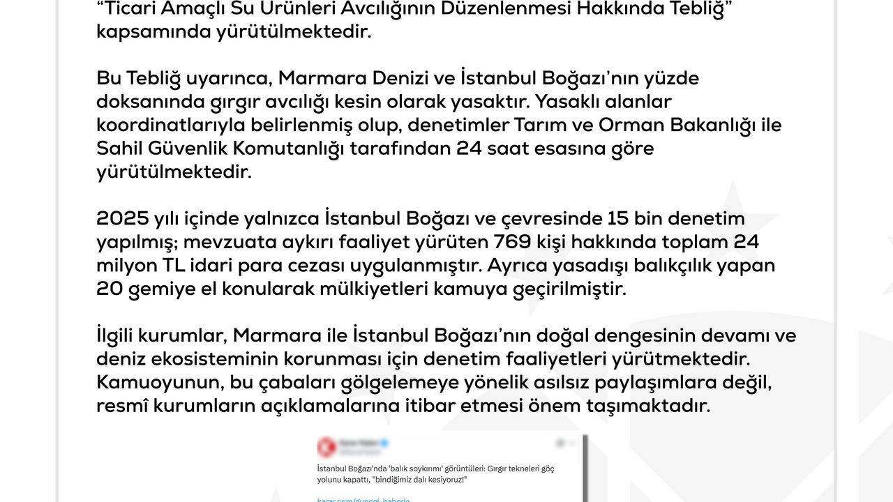 DMM'nin sosyal medya hesabından yapılan açıklamada, "Bazı basın yayın organlarında yer alan, 'İstanbul Boğazı'nda onlarca gırgır teknesi göç eden balıkların önünü kesiyor, balık soykırımı yaşanıyor' yönündeki iddialar tamamen asılsız olup, kamuoyunu yanıltmaya yönelik dezenformasyon içermektedir. Türkiye'de denizlerde yapılan tüm balıkçılık faaliyetleri, 1380 sayılı Su Ürünleri Kanunu ve Tarım ve Orman Bakanlığı tarafından yayımlanan 'Ticari Amaçlı Su Ürünleri Avcılığının Düzenlenmesi Hakkında Tebliğ' kapsamında yürütülmektedir. Bu tebliğ uyarınca, Marmara Denizi ve İstanbul Boğazı'nın yüzde 90'ında gırgır avcılığı kesin olarak yasaktır. Yasaklı alanlar koordinatlarıyla belirlenmiş olup, denetimler Tarım ve Orman Bakanlığı ile Sahil Güvenlik Komutanlığı tarafından 24 saat esasına göre yürütülmektedir. 2025 yılı içinde yalnızca İstanbul Boğazı ve çevresinde 15 bin denetim yapılmış; mevzuata aykırı faaliyet yürüten 769 kişi hakkında toplam 24 milyon TL idari para cezası uygulanmıştır. Ayrıca yasa dışı balıkçılık yapan 20 gemiye el konularak mülkiyetleri kamuya geçirilmiştir. İlgili kurumlar, Marmara ile İstanbul Boğazı'nın doğal dengesinin devamı ve deniz ekosisteminin korunması için denetim faaliyetleri yürütmektedir. Kamuoyunun, bu çabaları gölgelemeye yönelik asılsız paylaşımlara değil, resmi kurumların açıklamalarına itibar etmesi önem taşımaktadır" ifadelerine yer verildi. (DHA)