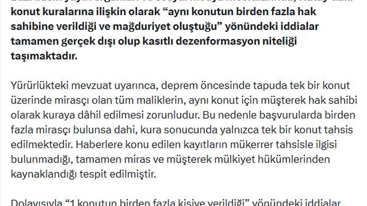 DMM'nin sanal medya hesabından yapılan açıklamada, 'Bazı basın yayın organları ve sosyal medya mecralarında, Hatay'daki konut kuralarına ilişkin olarak 'aynı konutun birden fazla hak sahibine verildiği ve mağduriyet oluştuğu' yönündeki iddialar tamamen gerçek dışı olup kasıtlı dezenformasyon niteliği taşımaktadır. Yürürlükteki mevzuat uyarınca, deprem öncesinde tapuda tek bir konut üzerinde mirasçı olan tüm maliklerin, aynı konut için müşterek hak sahibi olarak kuraya dahil edilmesi zorunludur. Bu nedenle başvurularda birden fazla mirasçı bulunsa dahi, kura sonucunda yalnızca tek bir konut tahsis edilmektedir. Haberlere konu edilen kayıtların mükerrer tahsisle ilgisi bulunmadığı, tamamen miras ve müşterek mülkiyet hükümlerinden kaynaklandığı tespit edilmiştir. Dolayısıyla '1 konutun birden fazla kişiye verildiği' yönündeki iddialar, mevzuatın bilinçli şekilde çarpıtılmasından ibarettir. Kamuoyunun, yalnızca resmi kurumlar tarafından yapılan açıklamaları dikkate alması önemle rica olunur' ifadelerine yer verildi. (DHA)