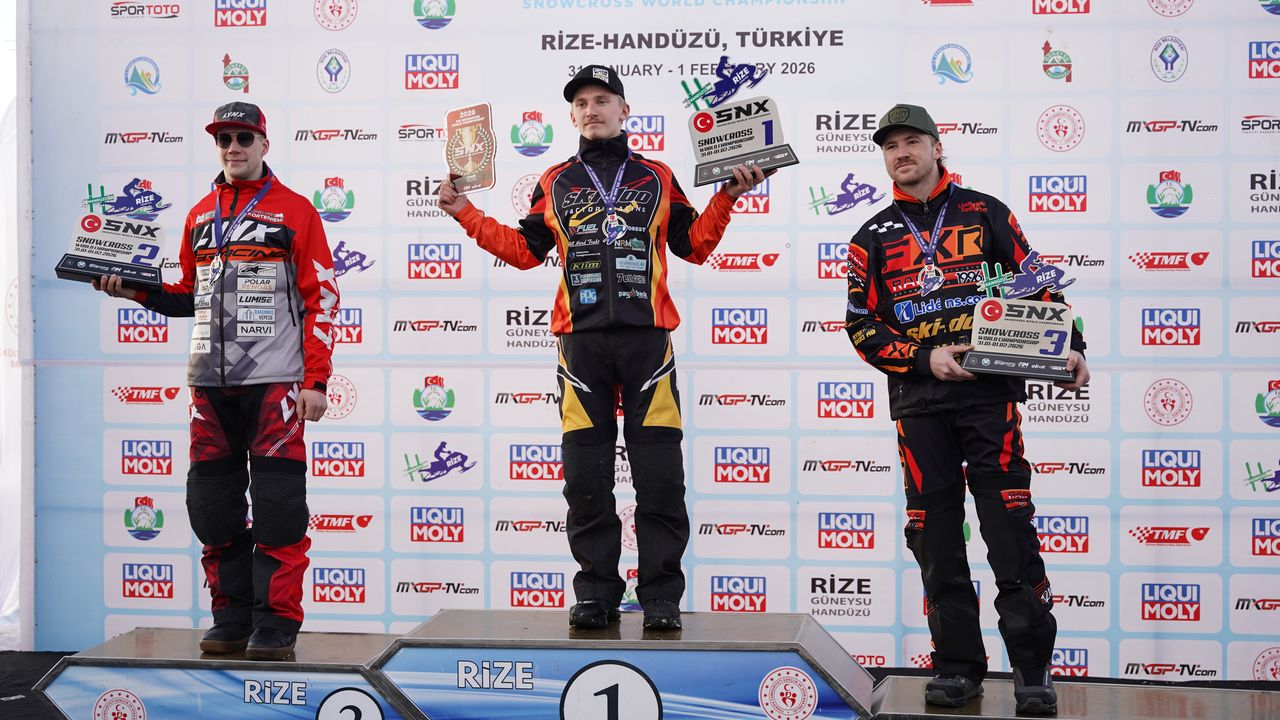 Mehmet Can PEÇE/GÜNEYSU,(DHA)- Mehmet Can PEÇE / RİZE,(DHA)- RİZE'de bin 800 rakımlı Handüzü Yaylası'nda Dünya Kar Motosikleti Şampiyonası'nın Türkiye ayağının ilk yarışı tamamlandı. Yarışları erkekler kategorisinde Olle Sahlström kadınlar kategorisinde ise Wilma Jonsson kazandı.