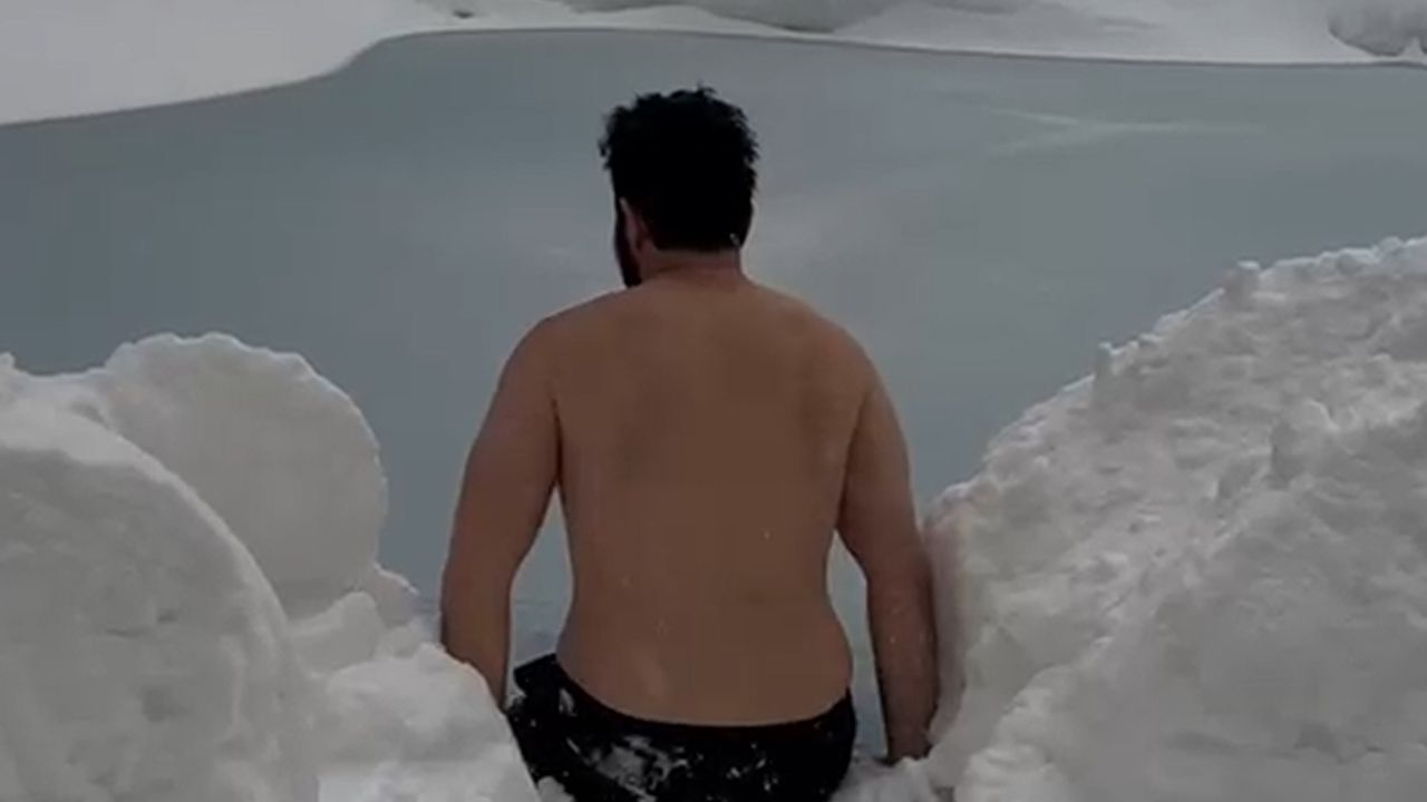 Bolu Dağı'nda günlerdir kar yağışı etkili olurken, hava sıcaklığı da sıfırın altında 10 dereceye kadar düştü. Tatil için kente gelen ve Bolu Dağı bölgesinde bir otelde konaklayan Eren Biri, soğuk havaya aldırış etmeden havuza girdi.