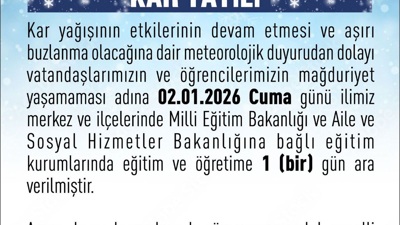 Elazığ Valiliği'nden yapılan açıklamada, 'Kar yağışının etkilerinin devam etmesi ve aşırı buzlanma olacağına dair meteorolojik duyurudan dolayı vatandaşlarımızın ve öğrencilerimizin mağduriyet yaşamaması adına 2 Ocak 2026 Cuma günü ilimiz merkez ve ilçelerinde Milli Eğitim Bakanlığı ve Aile ve Sosyal Hizmetler Bakanlığına bağlı eğitim kurumlarında eğitim ve öğretime 1 (bir) gün ara verilmiştir. Ayrıca, kamu kurumlarında görev yapan malul, engelli ve hamile personel idari izinli sayılacaktır' denildi. (DHA)