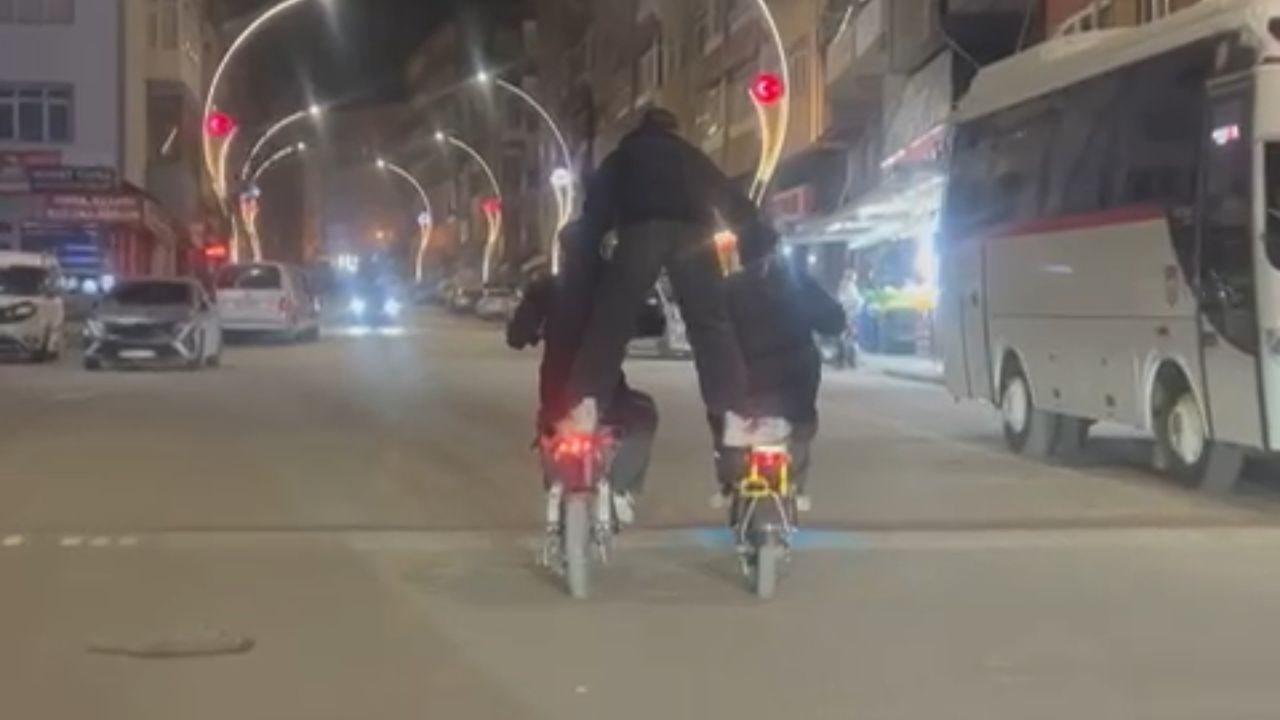 Olay dün akşam saatlerinde Yeşil Mahalle Taşkent Caddesi’nde meydana geldi. İki elektrikli bisiklete ayaklarını uzatan kişi sürücülere tutunup caddede ilerledi. Tehlikeli yolculuk caddeden geçen bir sürücü tarafından görüntülendi. (DHA)