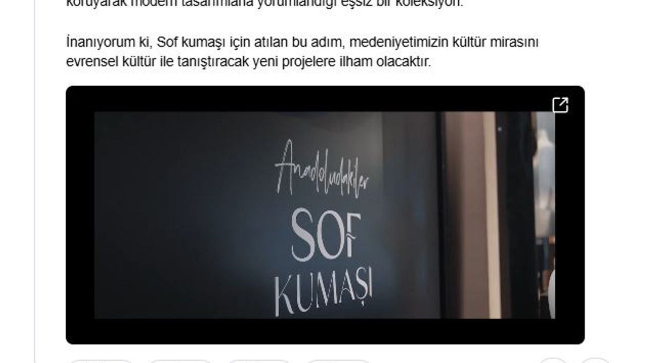 ANKARA, (DHA)- CUMHURBAŞKANI Recep Tayyip Erdoğan'ın eşi Emine Erdoğan, 'Anadoludakiler: Sof'un Zamansız Yolculuğu Sergisi'ne ilişkin yaptığı paylaşımda, serginin gelenekselin ruhunu ve özünü koruyarak modern tasarımlarla yorumlandığı eşsiz bir koleksiyon olduğunu belirtti.