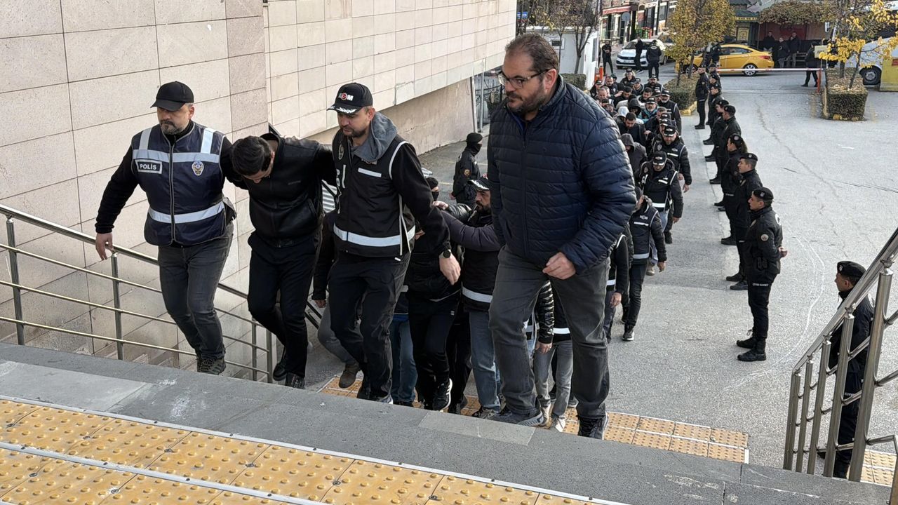 Eskişehir Emniyet Müdürlüğü’nde ifadeleri alınan 20 şüpheli, işlemlerinin ardından 'Kasten öldürmeye teşebbüs, silahla yaralama, çek senet tahsilatı, genel güvenliği kasten tehlikeye sokmak, tehdit, mala zarar verme, işyeri kurşunlanması ve rüşvet' suçlarından adliyeye sevk edildi. (DHA)