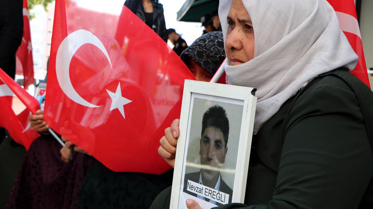 Terör örgütü PKK tarafından çocuklarının kaçırıldığını belirten aileler, 110'uncu haftada da Menekşe Sokak'ta bir araya geldi. Aileler, ellerinde Türk bayrakları ve çocuklarının fotoğrafları ile DEM Parti il binasına kadar yürüdü. Yürüyüşte polis güvenlik önlemi alırken, aileler, 'Terörsüz Türkiye' süreci nedeniyle slogan atmadan sessizce DEM Parti önüne geldi.