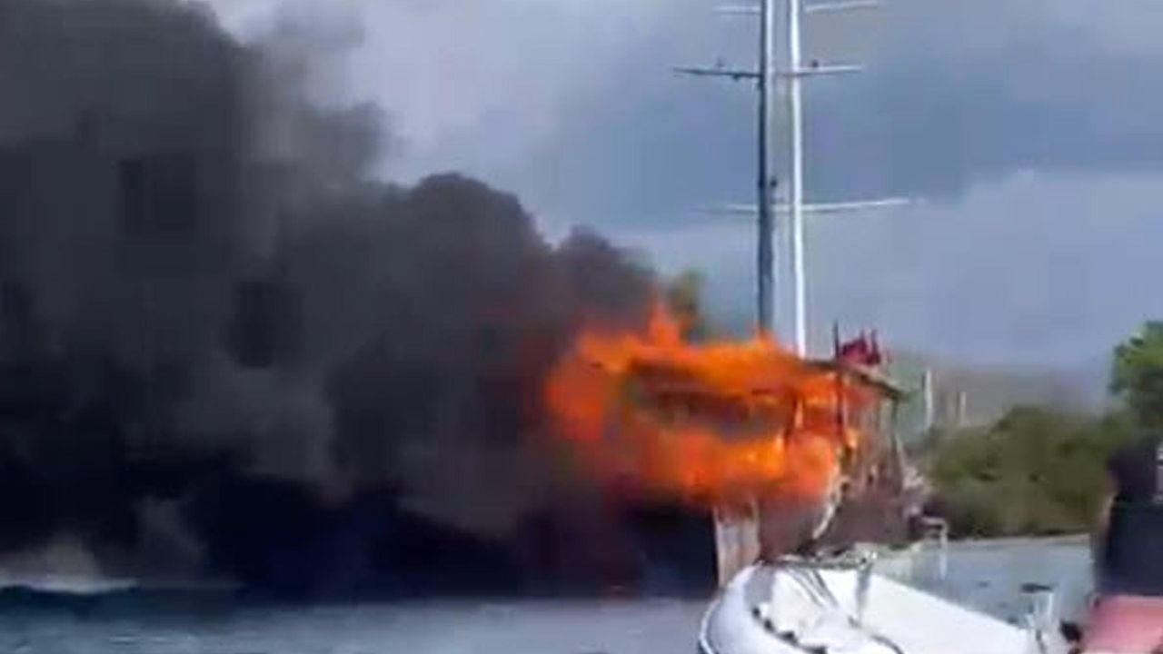 Fethiye ile Göcek arasındaki Yassıada yakınlarında bir gulette saat 14.00 sıralarında yangın çıktı. Alevler kısa sürede tekneyi sardı. Çevredekilerin ihbarı üzerine bölgeye Sahil Güvenlik Komutanlığı ve Kıyı Emniyeti Genel Müdürlüğü ekipleri sevk edildi. Ekipler alevleri söndürmek için denizden müdahale ediyor. (DHA)