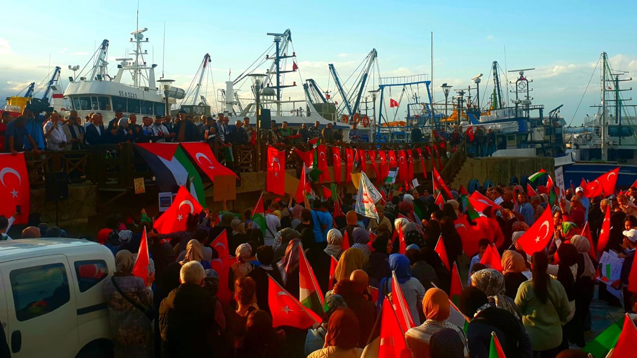 Musa KESKİN/DÜZCE,(DHA) - DÜZCE’nin Akçakoca ilçesinde vatandaşlar, Gazze’ye insani yardım ulaştırmak için yola çıkan ve İsrail’in saldırısına uğrayan küresel Sumud filosuna destek için Akçakoca Limanı’nda toplandı.
