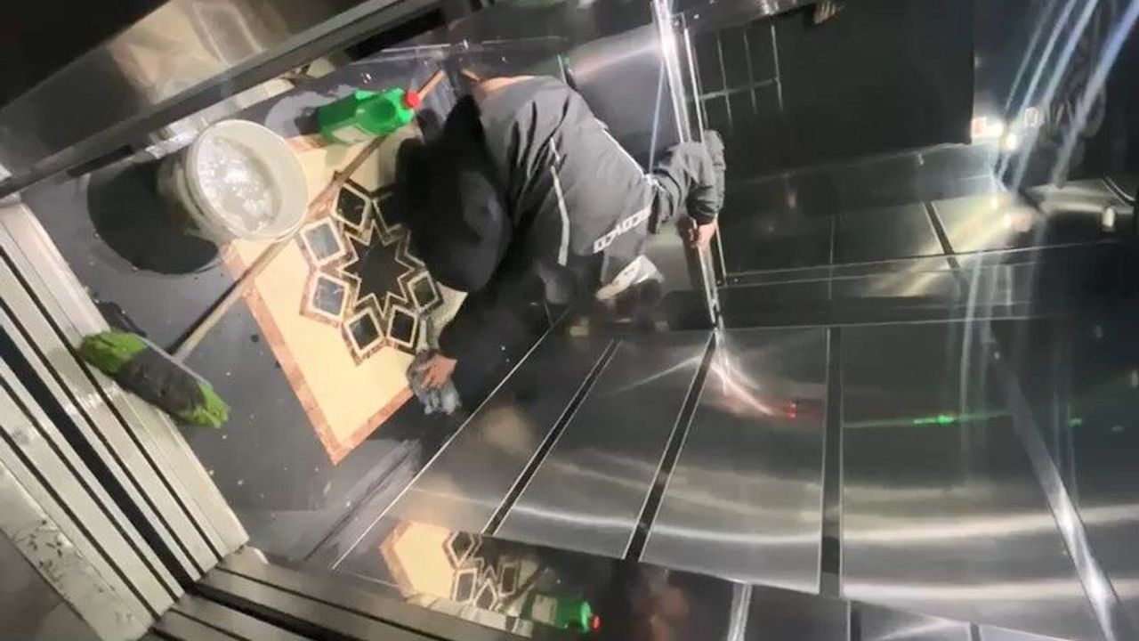Görüntü üzerine yerel kurye firmasının sahibi, kuryeye asansörü temizletti ve o anları cep telefonuyla kayda aldı.