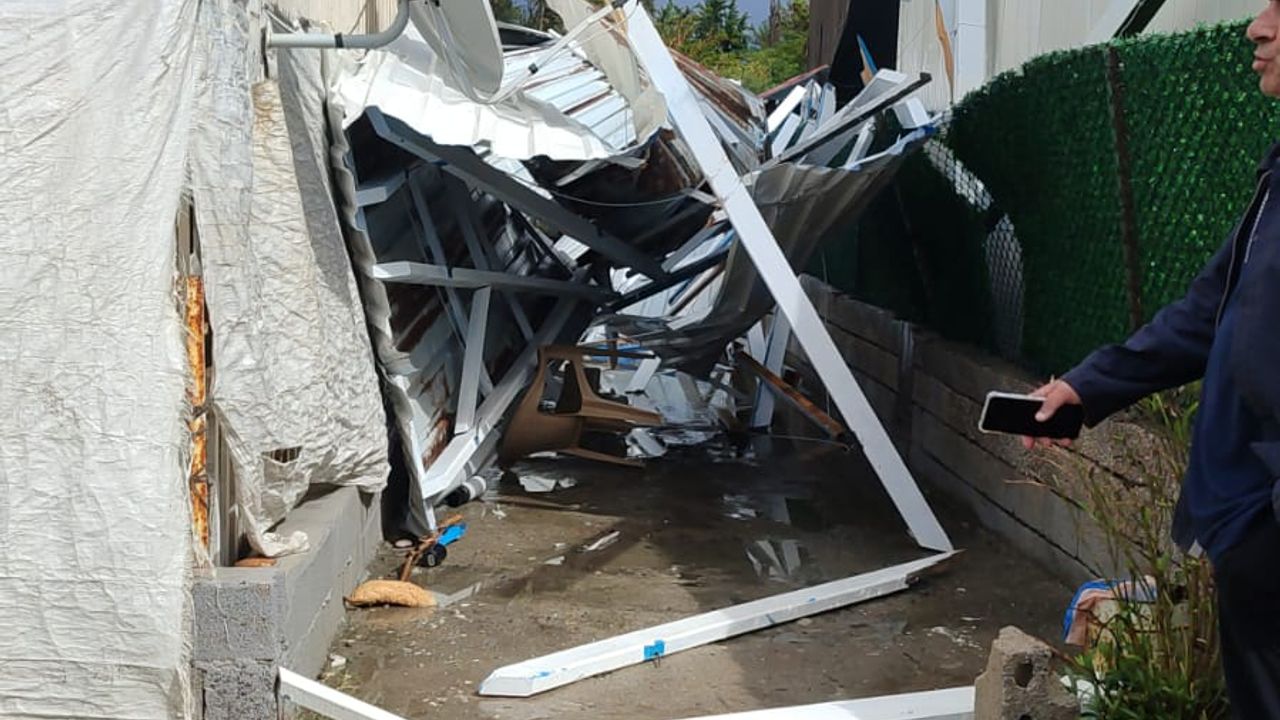 Dörtyol ilçesinde sağanak ve fırtına etkili oldu. Öğle saatleri başlayan yağış nedeniyle yollar göle döndü. Vatandaşlar zor anlar yaşarken, fırtına nedeniyle 2 binanın çatısı uçtu, iş yerlerinin tabelaları devrildi. Kopan çatı parçaları nedeniyle 3 otomobil zarar gördü, ihbarlar sonrası bölgede hasar tespit çalışmaları başladı. (DHA)