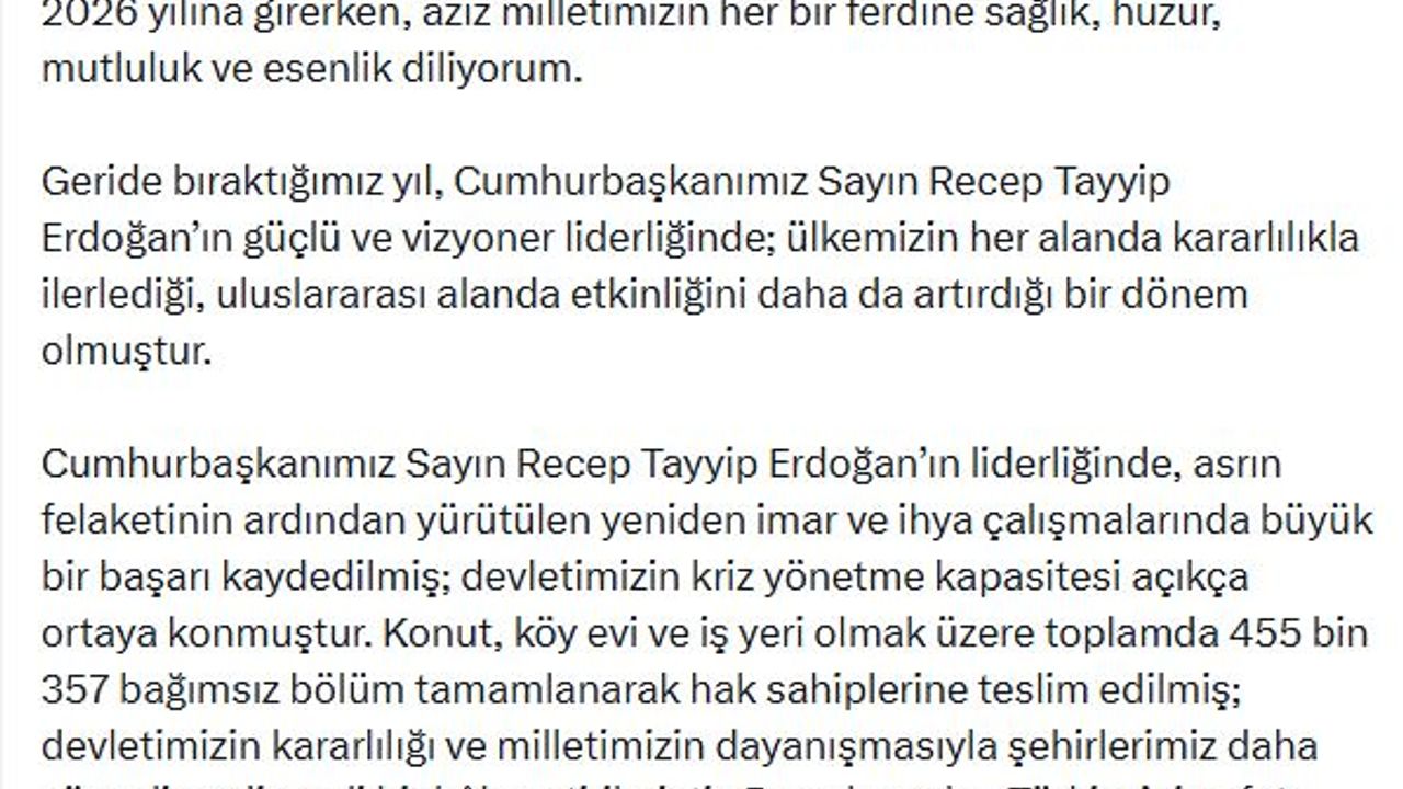 İletişim Başkanı Burhanettin Duran, sanal medya hesabından yeni yıl mesajı yayımladı. Duran, paylaşımında, '2026 yılına girerken, aziz milletimizin her bir ferdine sağlık, huzur, mutluluk ve esenlik diliyorum. Geride bıraktığımız yıl, Cumhurbaşkanımız Sayın Recep Tayyip Erdoğan'ın güçlü ve vizyoner liderliğinde; ülkemizin her alanda kararlılıkla ilerlediği, uluslararası alanda etkinliğini daha da artırdığı bir dönem olmuştur. Cumhurbaşkanımız Sayın Recep Tayyip Erdoğan'ın liderliğinde, asrın felaketinin ardından yürütülen yeniden imar ve ihya çalışmalarında büyük bir başarı kaydedilmiş, devletimizin kriz yönetme kapasitesi açıkça ortaya konmuştur. Konut, köy evi ve iş yeri olmak üzere toplamda 455 bin 357 bağımsız bölüm tamamlanarak hak sahiplerine teslim edilmiş, devletimizin kararlılığı ve milletimizin dayanışmasıyla şehirlerimiz daha güvenli ve dirençli bir hale getirilmiştir. Bu çalışmalar, Türkiye'nin afet yönetimindeki gücünü ve devlet-millet el ele anlayışını bir kez daha göstermiştir' dedi.