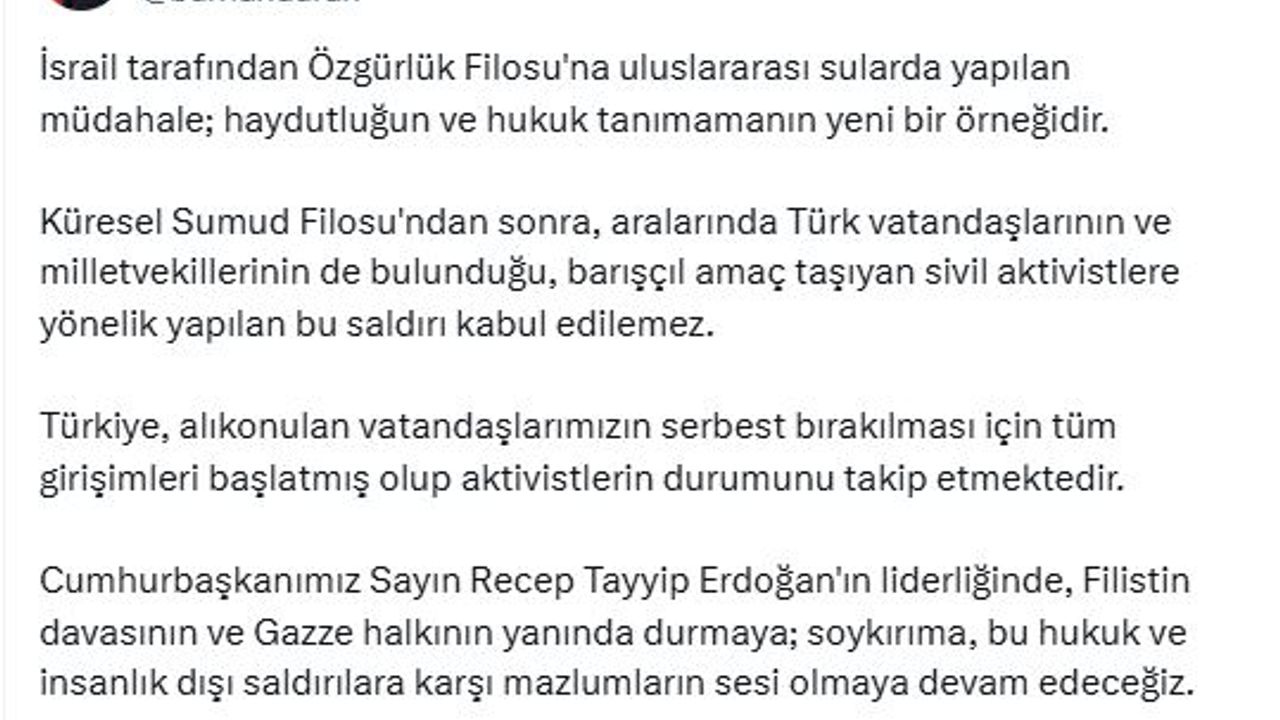İletişim Başkanı Burhanettin Duran, Gazze'ye yardım götüren Özgürlük Filosu'na İsrail'in uluslararası sularda yaptığı müdahaleye ilişkin, sosyal medya hesabından açıklama yaptı. Duran, "İsrail tarafından Özgürlük Filosu'na uluslararası sularda yapılan müdahale, haydutluğun ve hukuk tanımamanın yeni bir örneğidir. Küresel Sumud Filosu'ndan sonra aralarında Türk vatandaşlarının ve milletvekillerinin de bulunduğu, barışçıl amaç taşıyan sivil aktivistlere yönelik yapılan bu saldırı kabul edilemez. Türkiye, alıkonulan vatandaşlarımızın serbest bırakılması için tüm girişimleri başlatmış olup aktivistlerin durumunu takip etmektedir. Cumhurbaşkanımız Sayın Recep Tayyip Erdoğan'ın liderliğinde, Filistin davasının ve Gazze halkının yanında durmaya; soykırıma, bu hukuk ve insanlık dışı saldırılara karşı mazlumların sesi olmaya devam edeceğiz" ifadelerini kullandı. (DHA)