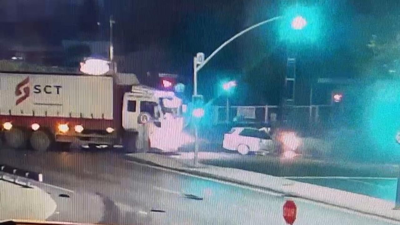 Kaza anı güvenlik kamerasına yansıdı. Görüntülerde kamyonun sola döndüğü sırada otomobilin çarptığı görülüyor.Kaza sonrası kamyon şoförü gözaltına alındı. (DHA)