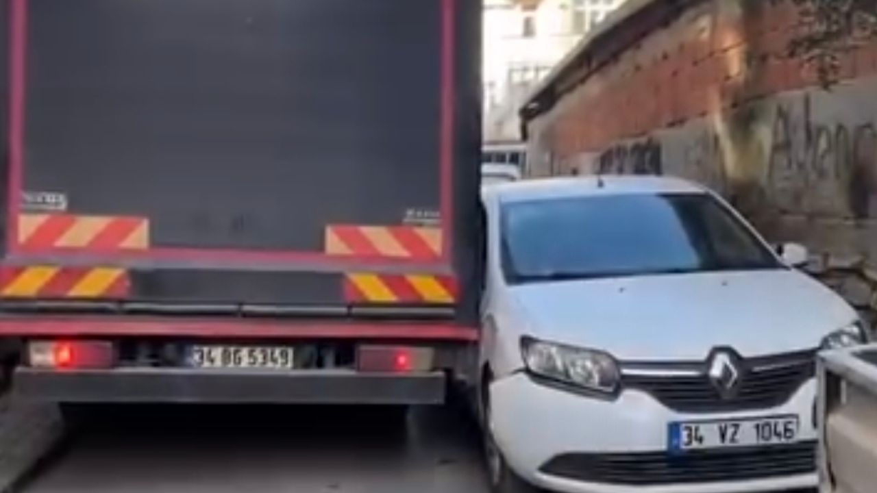 Olay, saat 11.30 sıralarında Silivrikapı Taşdelen Sokak'ta meydana geldi. İddiaya göre şoförünün idaresindeki 34 BG 5349 plakalı kamyon, park halindeki araçlar nedeniyle sokaktan geçirmeyince, araçlara çarparak yoluna devam etti. Kamyonun çarptığı araçlarda hasar meydana geldi. Yaşananlar başka bir sürücü tarafından cep telefonu kamerasıyla kaydedildi. (DHA)