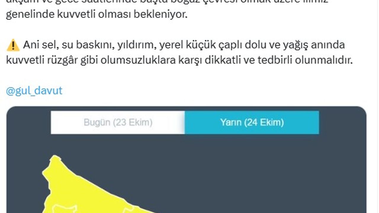 İstanbul Valiliği, Meteoroloji Genel Müdürlüğü'nden alınan raporun ardından kentin Avrupa Yakası için sarı kodlu sağanak yağış uyarısı yayınladı. Valiliğin sosyal medya hesabından yayınlanan uyarıda "Meteoroloji Genel Müdürlüğü'nün yaptığı son değerlendirmelere göre, Yarın (Cuma) öğle saatlerinden sonra 'İstanbul'un Avrupa Yakası'ndan' itibaren başlayacak olan gök gürültülü sağanak yağışların, akşam ve gece saatlerinde başta boğaz çevresi olmak üzere ilimiz genelinde kuvvetli olması bekleniyor. Ani sel, su baskını, yıldırım, yerel küçük çaplı dolu ve yağış anında kuvvetli rüzgâr gibi olumsuzluklara karşı dikkatli ve tedbirli olunmalıdır" ifadelerine yer verildi. (DHA)