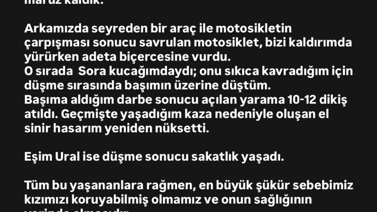 Sosyal medya hesabından kazaya dair açıklama yapan İrem Helvacıoğlu, "Öncelikle merak eden, arayan herkese çok teşekkür ederiz. Trafik kurallarının ihlali sonucu meydana gelen bir kazaya, kaldırımda evimize giderken ne yazık ki biz de maruz kaldık. Arkamızda seyreden bir araç ile motosikletin çarpışması sonucu savrulan motosiklet, bizi kaldırımda yürürken adeta biçercesine vurdu. O sırada Sora kucağımdaydı. Onu sıkıca kavradığım için düşme sırasında başımın üzerine düştüm. Başıma aldığım darbe sonucu açılan yarama 10-12 dikiş atıldı. Geçmişte yaşadığım kaza nedeniyle oluşan el sinir hasarım yeniden nüksetti. Eşim Ural ise düşme sonucu sakatlık yaşadı. Tüm bu yaşananlara rağmen, en büyük şükür sebebimiz kızımızı koruyabilmiş olmamız ve onun sağlığının yerinde olmasıdır. Kazaya karışan ve yaralanan herkese geçmiş olsun dileklerimizi iletiyoruz. Ancak bu olay, trafikte kurallara uymamanın ne kadar ağır sonuçlar doğurabileceğini bir kez daha göstermiştir. Bu nedenle, yaşananların cezasız kalmaması ve benzer olayların tekrar etmemesi adına hukuki sürecin kararlılıkla takipçisi olacağız" ifadelerini kullandı. (DHA)