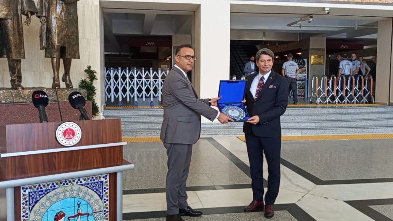 Veda konuşması sonrası Başsavcı Hüseyin Gümüş ve Başsavcı Vekili Bülent Dinçel'e plaket takdim edildi. (DHA)