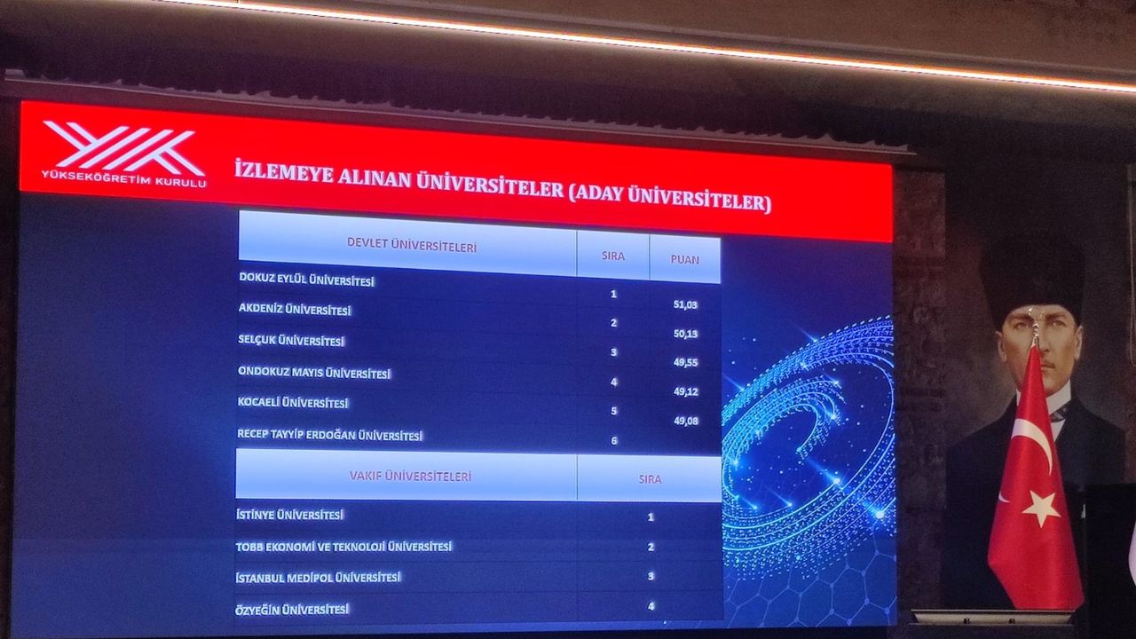 Özvar, “İzlemeye alınan üniversitelerimize yeni üniversiteler katıldı. Bu vesileyle bu üniversitelerimizi de kutluyoruz. Recep Tayyip Erdoğan Üniversitesi izlemeye alındı. Vakıf üniversitelerinden İstinye Üniversitesi, TOBB Ekonomi ve Teknoloji Üniversitesi, İstanbul Medipol Üniversitesi ve Özyeğin Üniversiteleri de vakıf üniversiteleri içerisinde izlemeye alınan diğer üniversiteler kategorisine girmiş oldu" ifadelerini kullandı. (DHA)