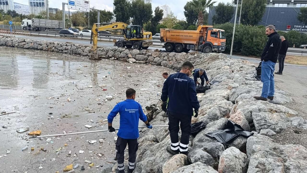 İzmir'de sağanakla birlikte Manda Çayı'ndan denize dökülen atıklar için temizlik çalışması başlatıldı. İzmir Büyükşehir Belediyesi ekipleri hem karadan kepçe ile hem de amfibik araçlarla atıkları toplamaya başladı. (DHA)