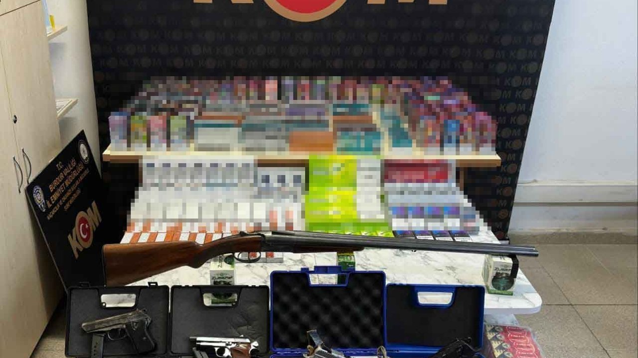 Yapılan aramalarda; 1494 litre sahte alkol yapımında kullanılan etil/metil alkol, 160 elektronik sigara, 250 paket ısıtılmış tütün ürünü, 150 paket kaçak sigara, 3 ruhsatsız tabanca, 2 kurusıkı tabanca, 1 ruhsatsız av tüfeği, 2 bin 90 tabanca fişeği, 150 kurusıkı tabanca fişeği, 185 av tüfeği kartuşu, 10 boş tabanca şarjörü, 280 kaçak şarj aleti ve başlığı ile 794 sigara sarma kağıdı ele geçirildi. (DHA)