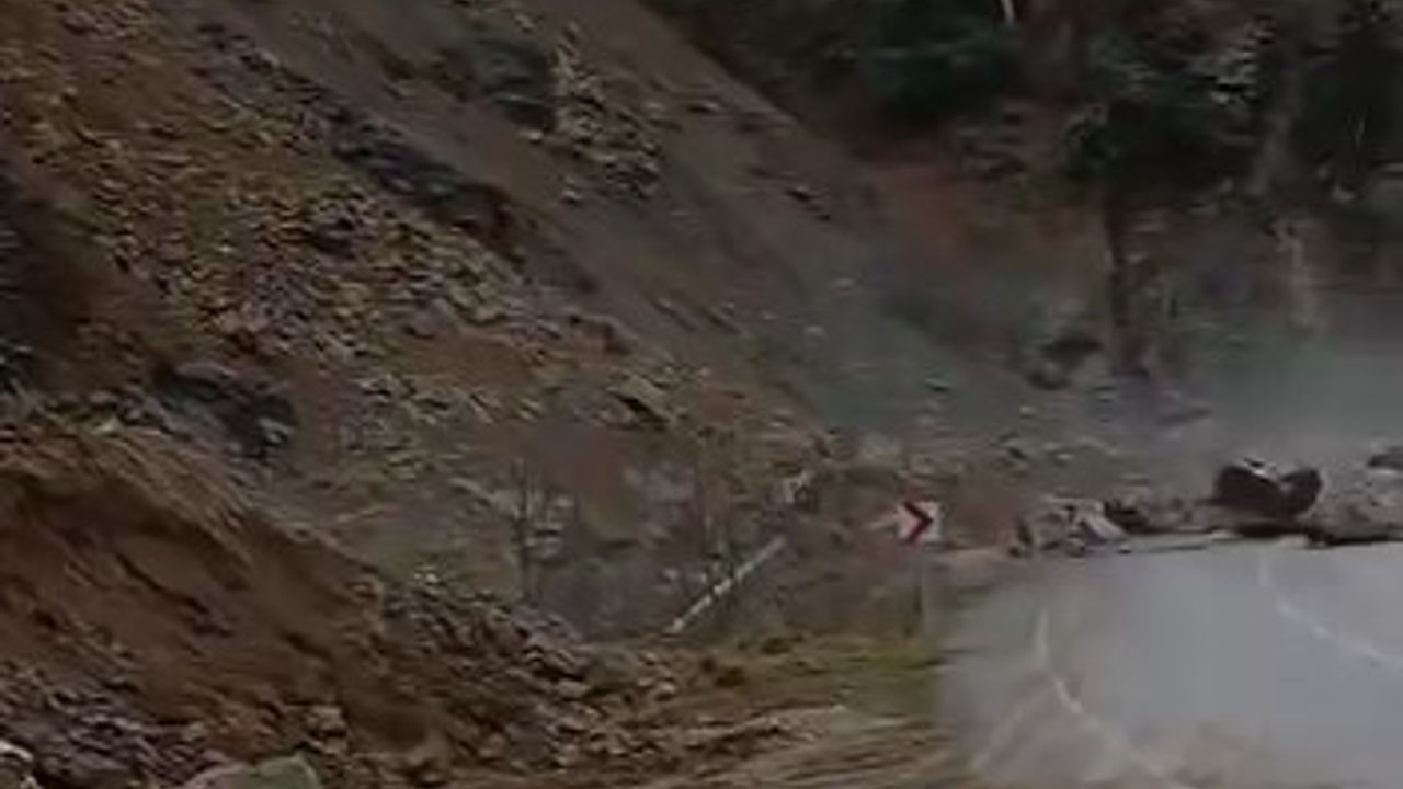 Rize'nin Çayeli ilçesinde meydana gelen heyelanda, yamaçtan kopan kayaların ulaşımı kapattığı yolda ekiplerin incelemeleri sürüyor. Yer yer akıntının sürdüğü yamaç, dronla görüntülendi. Tedbir amaçlı ulaşıma kapatılan yolda, heyelan anlarına ait yeni görüntüler de ortaya çıktı. Görüntülerde; kayaların hızla yamaçtan kopup yola düştüğü, çevreyi toz bulutunun kapladığı, jandarma ekiplerinin yolda önlemler aldığı anlar yer aldı. (DHA)