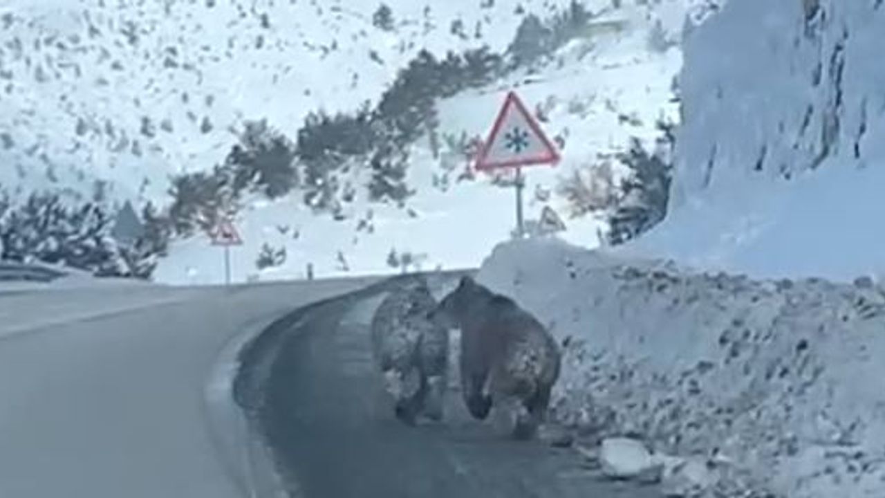 Devrekani-Kastamonu kara yolunun Oyrak Geçidi mevkisinde 4 bozayı, kara yoluna çıktı. Sürücüler tarafından cep telefonu kameralarıyla görüntülenen bozayıların, yolda bir süre koştuktan sonra ormana yöneldiği görüldü. (DHA)